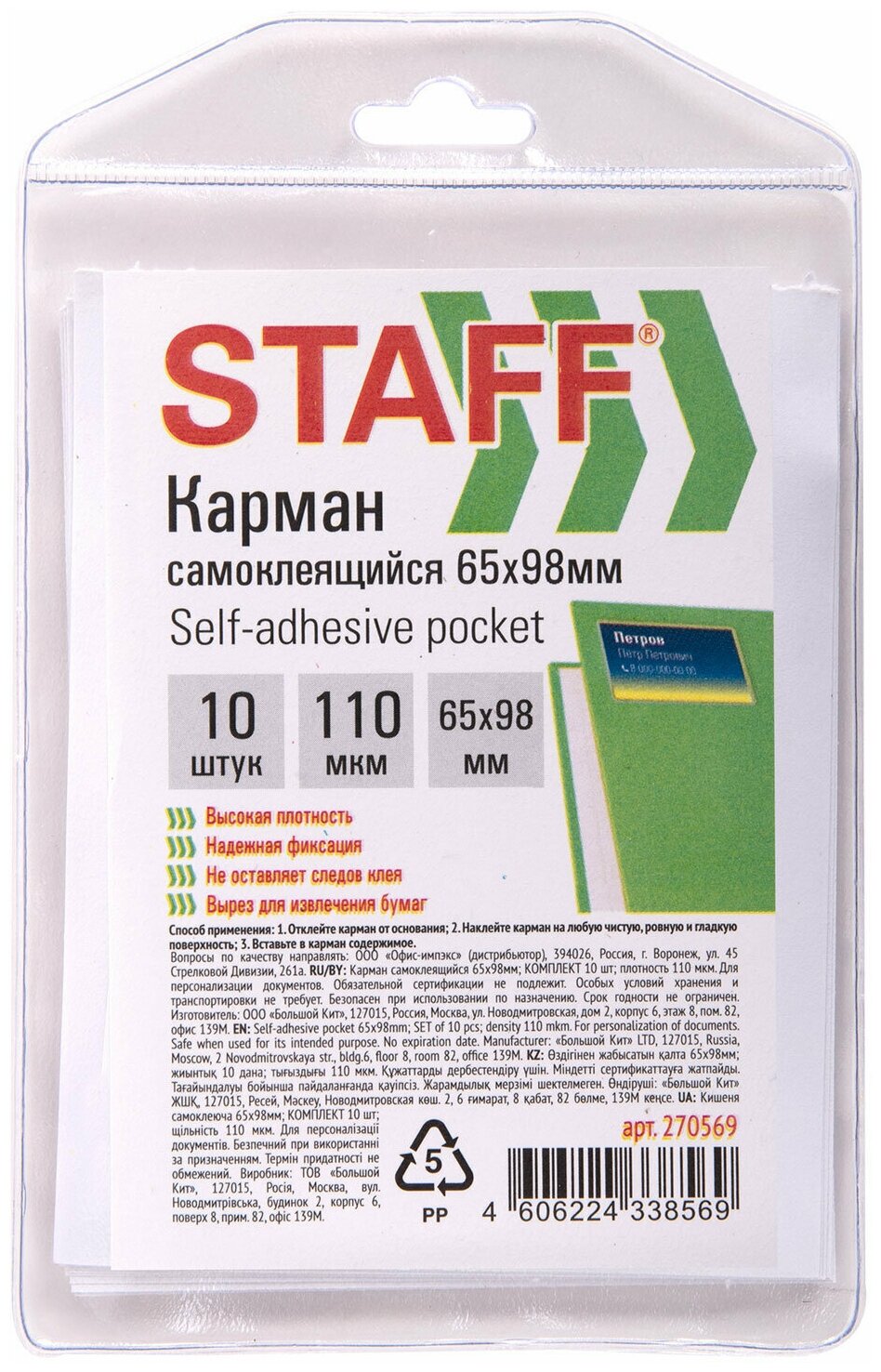 | Прочие особенности и свойства | Карман самоклеящийся предназначен для размещения информации на корешке папки. Клейкий, прозрачный слой позволяет разместить карман на любых гладких поверхностях. При переклеивании не оставляет следов. |
