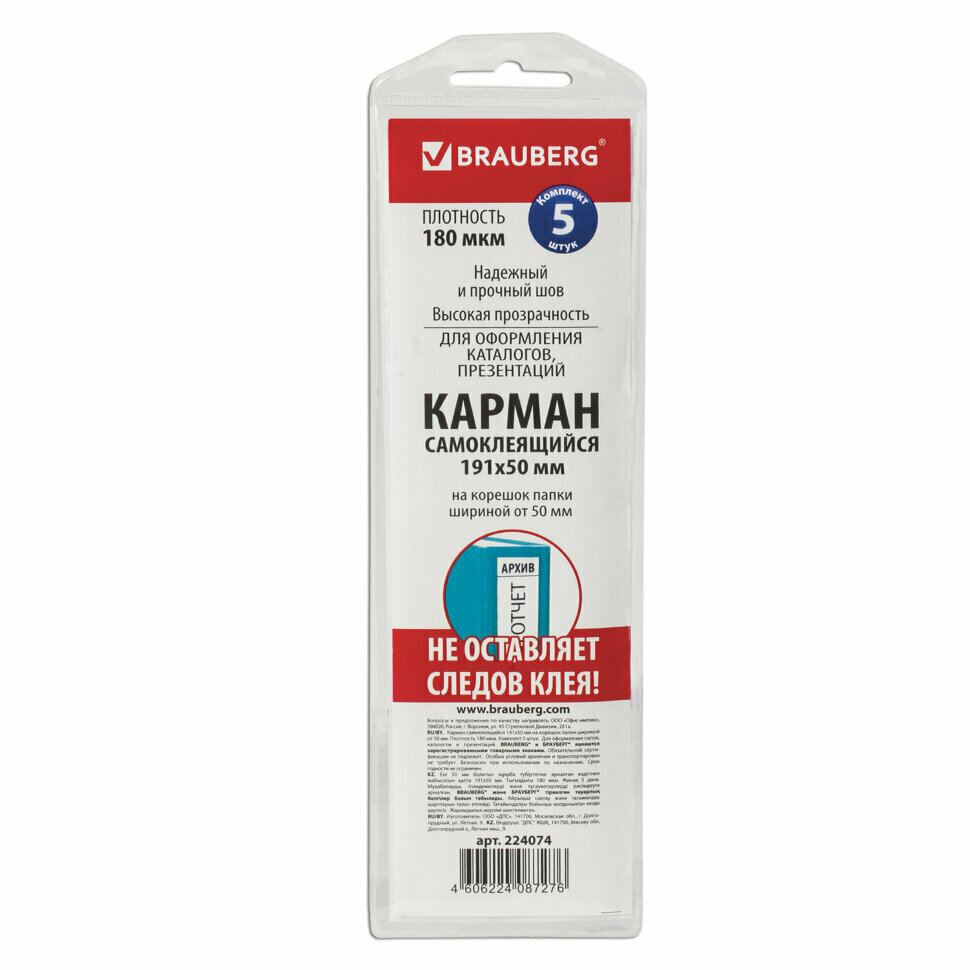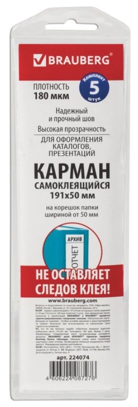 BRAUBERG Карманы самоклеящиеся на корешок папки 70 мм 191х50 мм 5 шт. прозрачные 224074