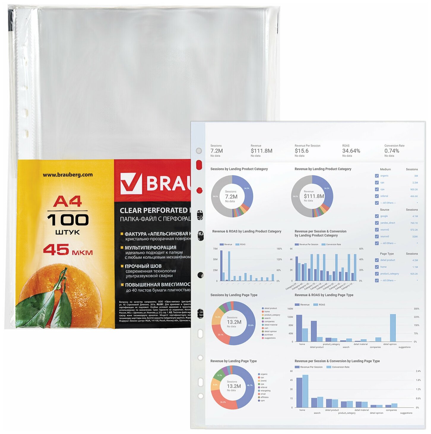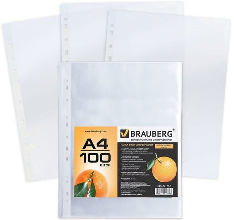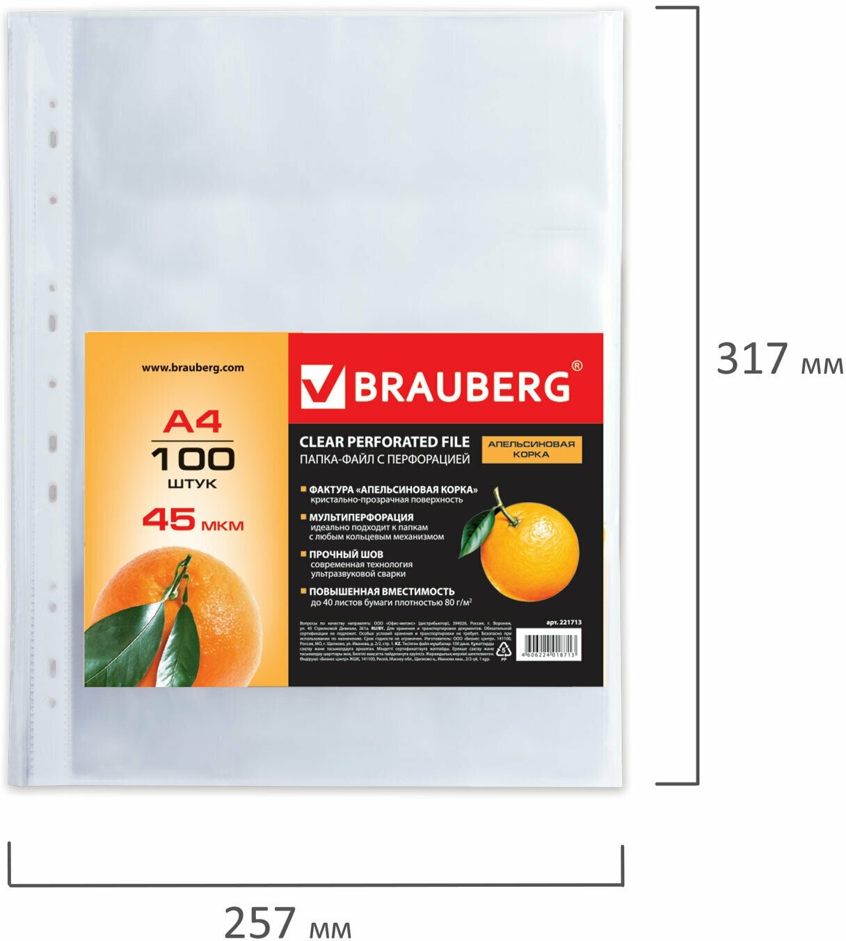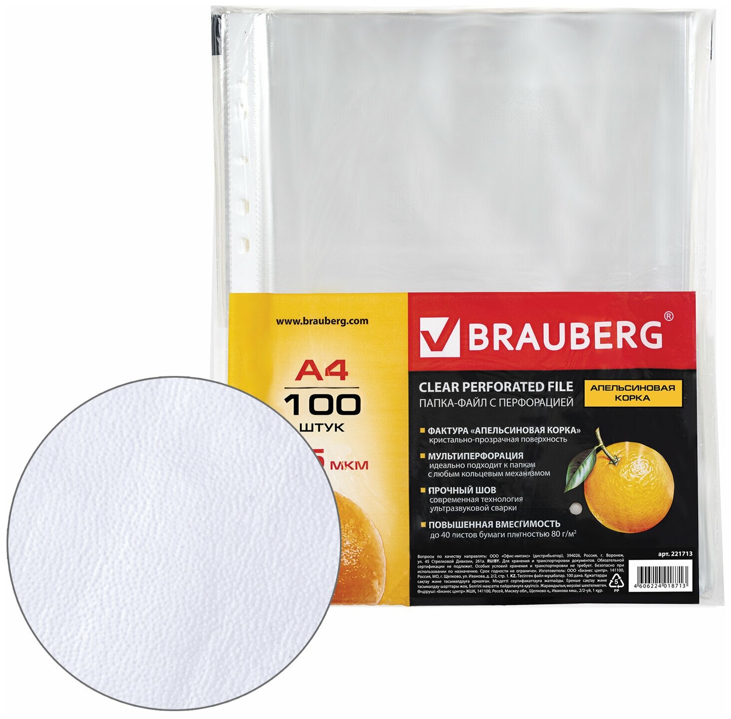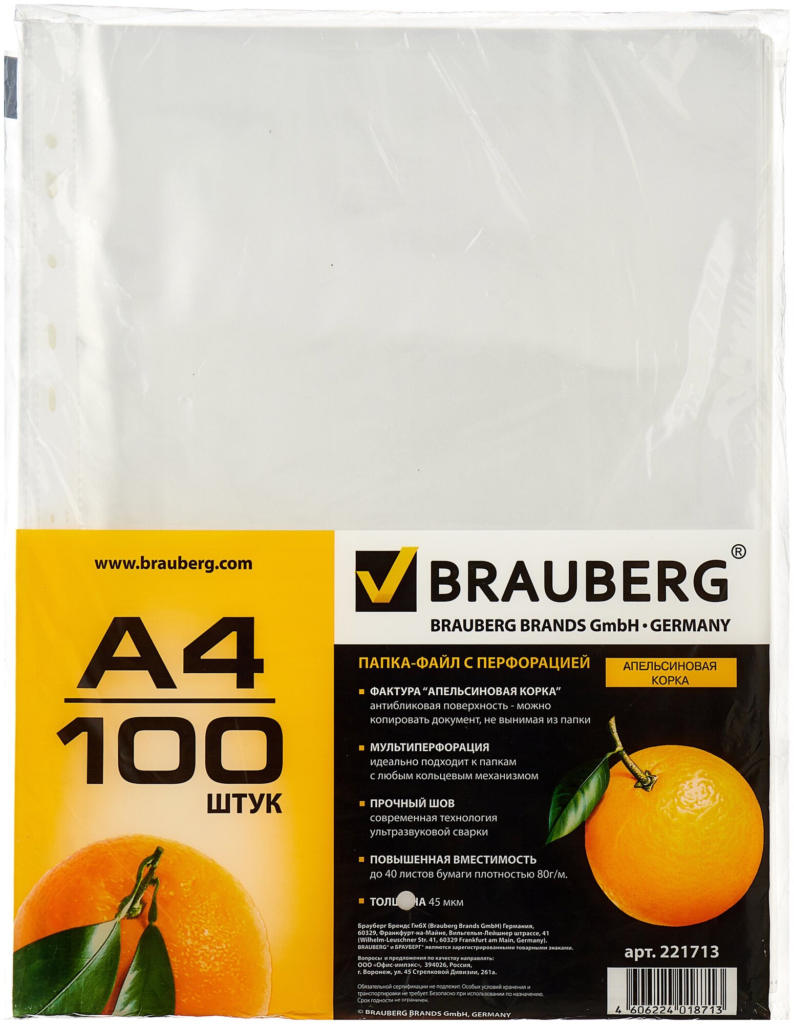 BRAUBERG папка-файл перфорированная Апельсиновая корка А4 45 мкм 100 шт. бесцветные 221713