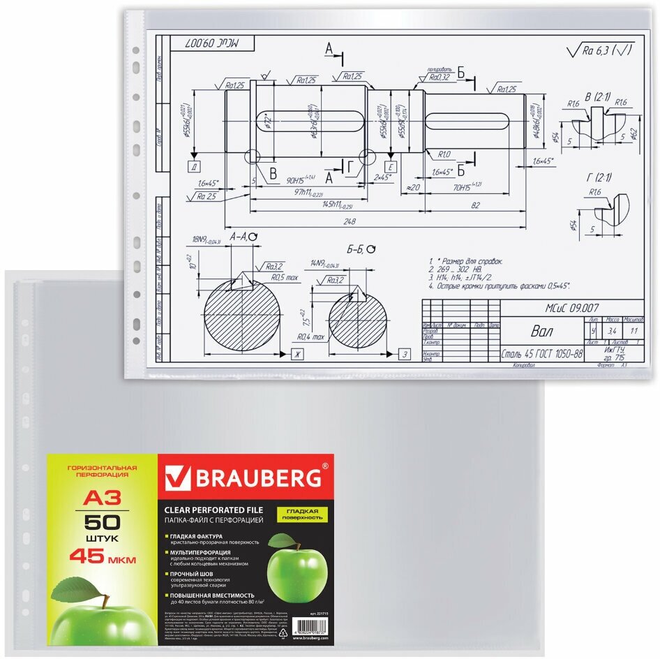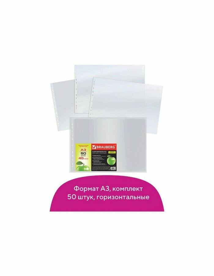 | Прочие особенности и свойства | Папка-файл перфорированная BRAUBERG подходит для подшивки документов в папки с любым кольцевым механизмом и скоросшивателем.,Ориентация:горизонтальная,Количество в комплекте:50 шт.,Фактура |