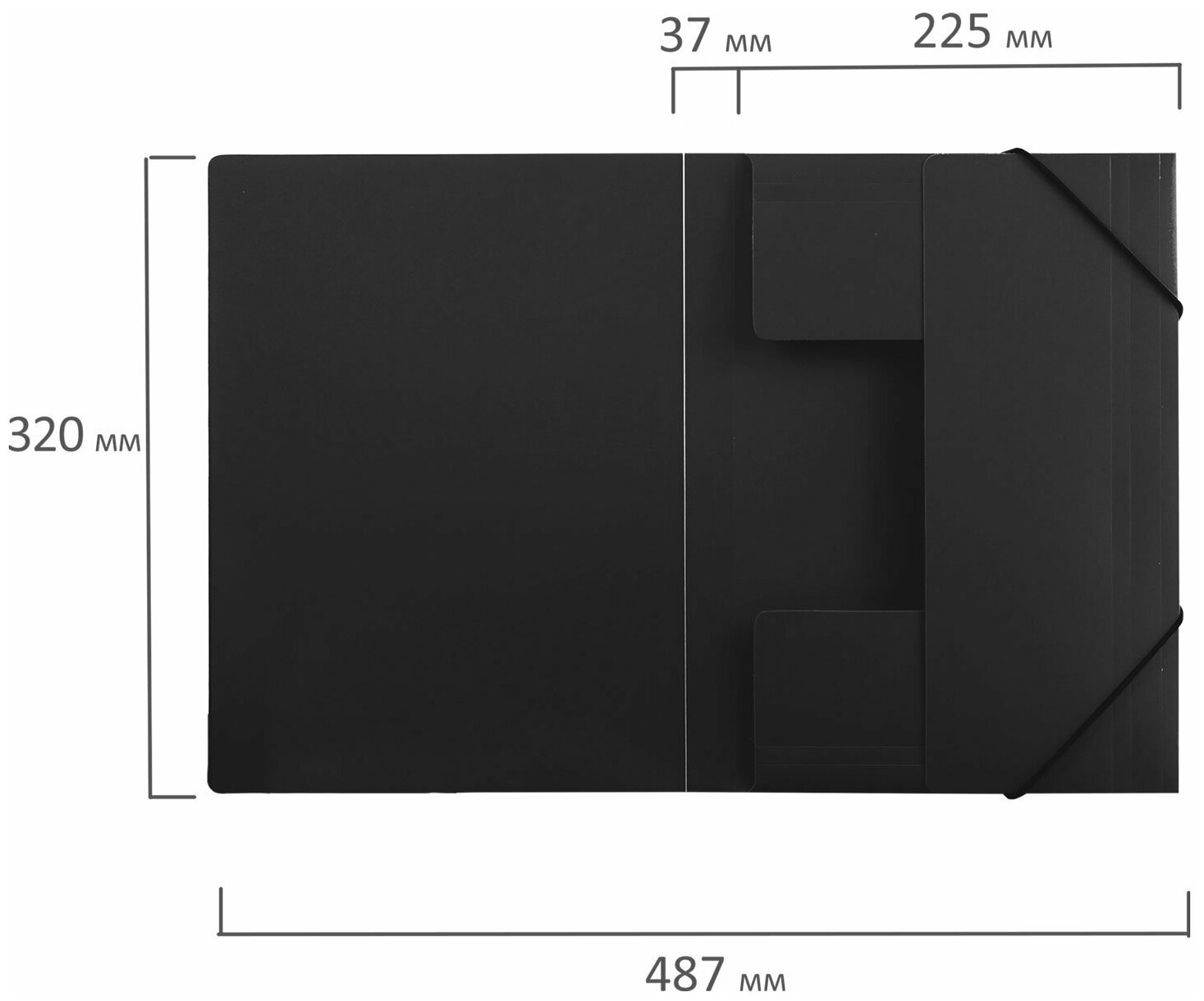 Предназначена для хранения документов. Клапаны папки надежно удерживают документы внутри, а резинки плотно закрывают папку. Изготовлена из плотного непрозрачного пластика., — Толщина пластика – 500 мкм.