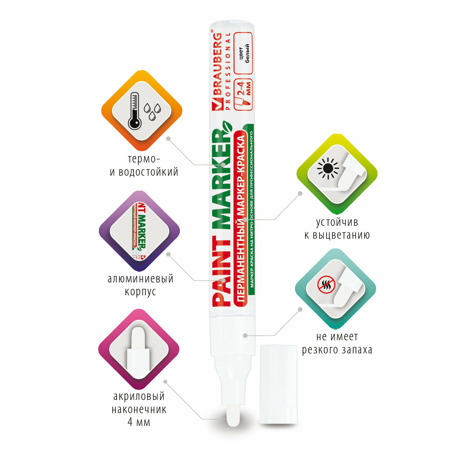 НЕ ИМЕЕТ РЕЗКОГО ЗАПАХА нитро-краски в отличие от большинства аналогов, что позволяет использовать данный маркер в закрытых помещениях без вреда для здоровья.