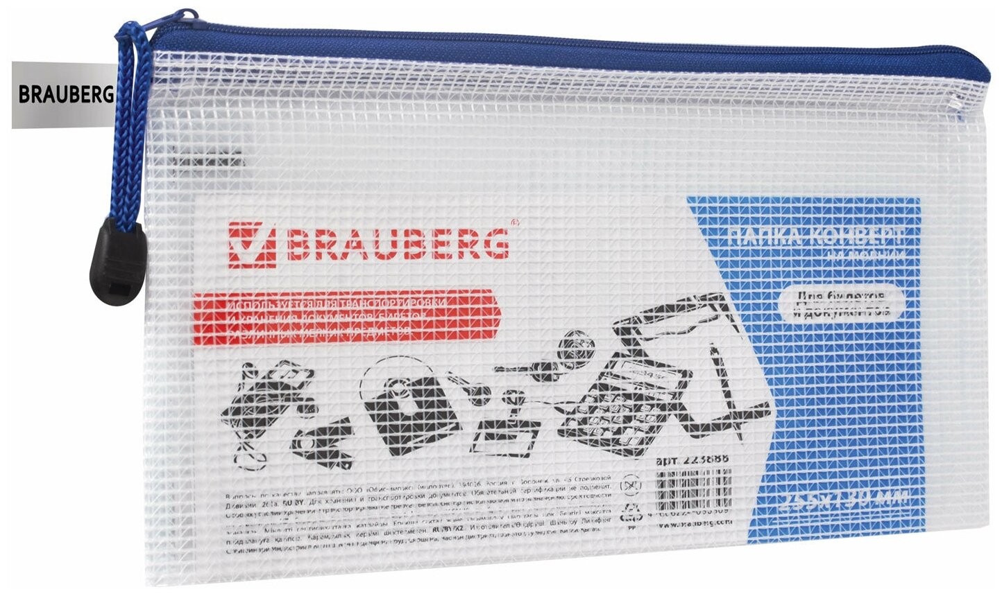 Папка-конверт на молнии малый формат (255х130 мм) молния ассорти сетка прозрачная 02 мм BRAUBERG "Segment" 223888 В комплекте: 12шт.