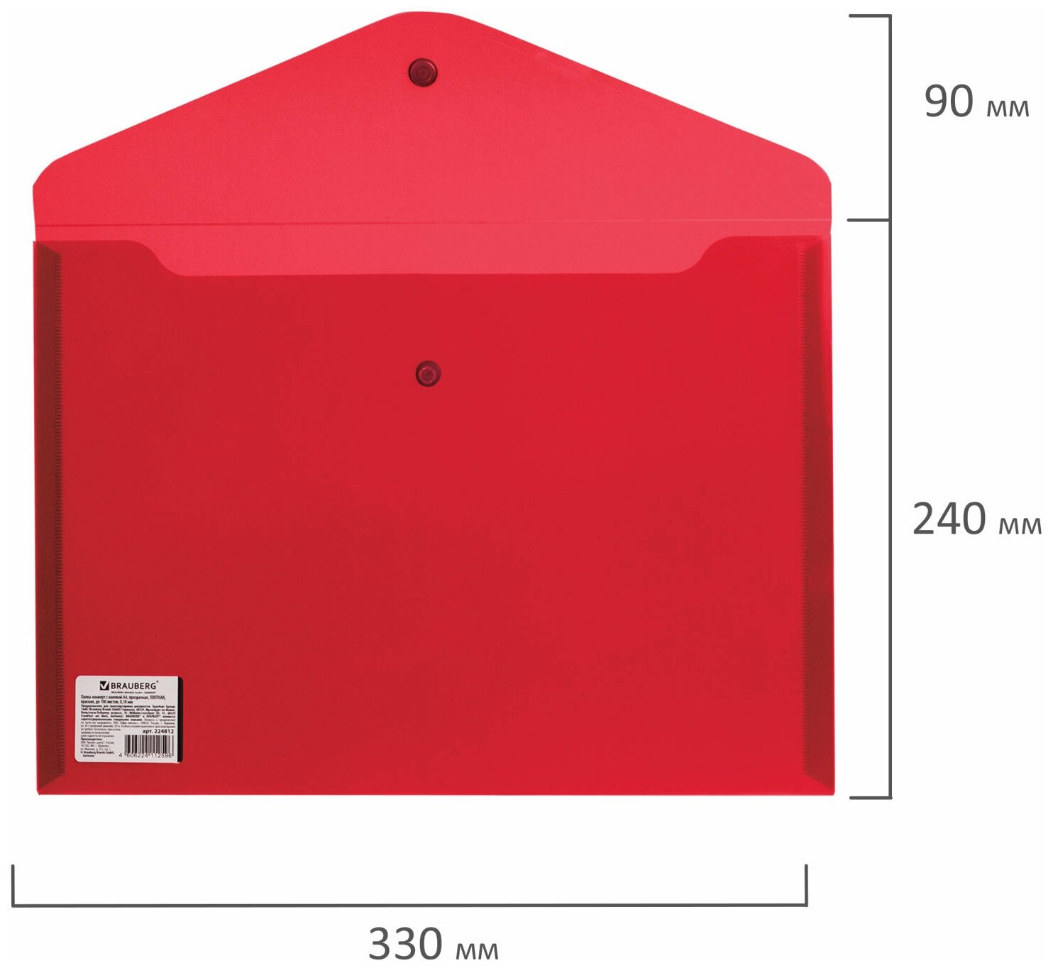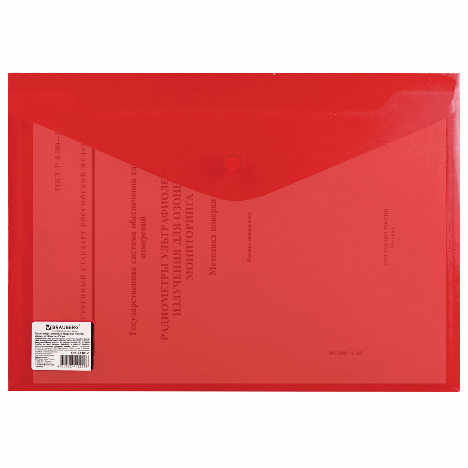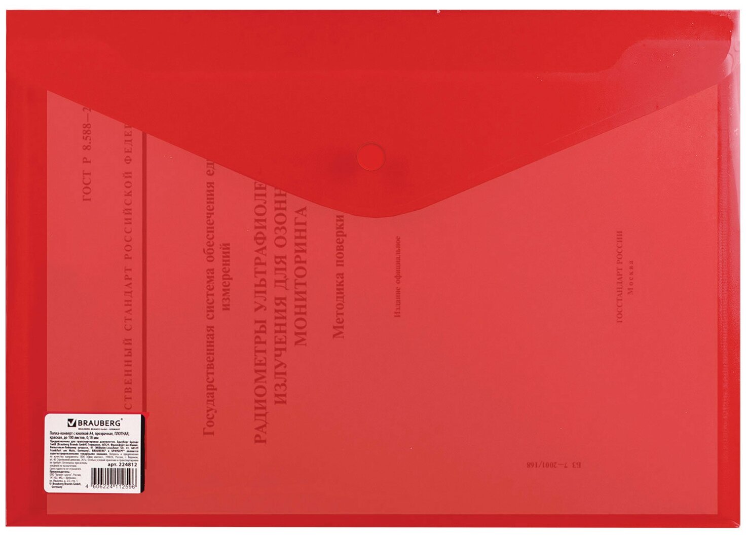 Папка-конверт с кнопкой BRAUBERG А4 до 100 листов прозрачная красная сверхпрочная 018 мм 224812