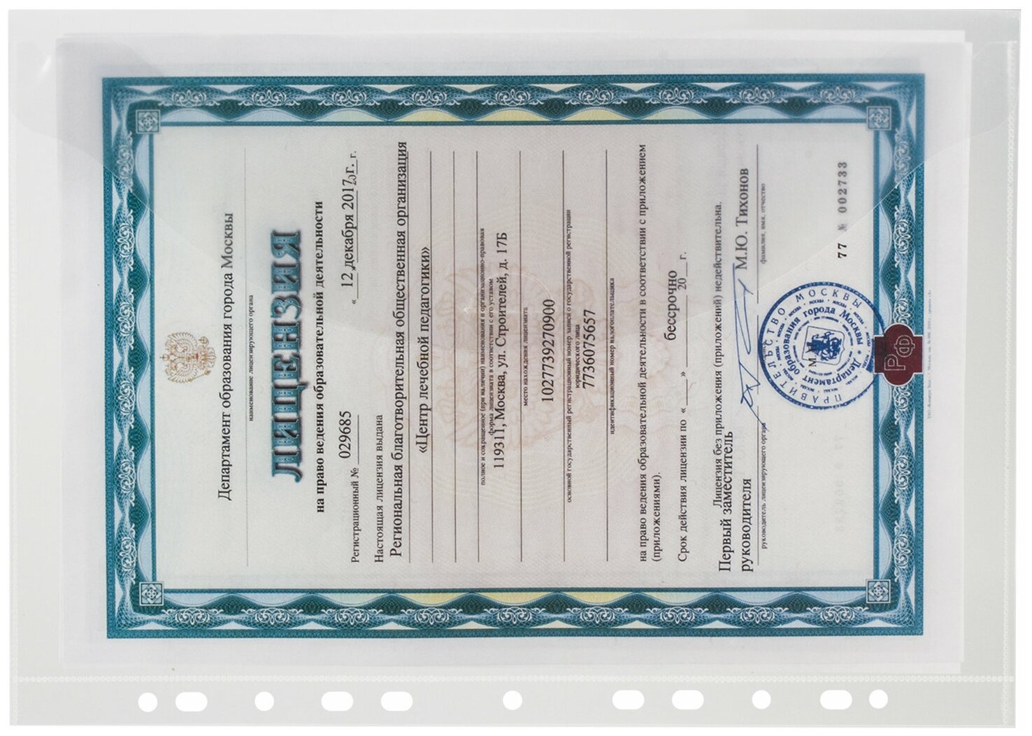 | Прочие особенности и свойства | Папка-конверт из плотного прозрачного пластика с мультиперфорацией по краю подшивается в папки с любым механизмом. Идеальное средство для хранения и транспортировки документов. Толщина пластика – 150 мкм. В комплекте - 10 штук. |