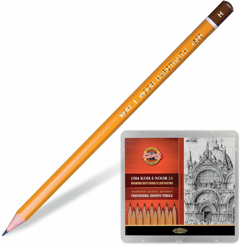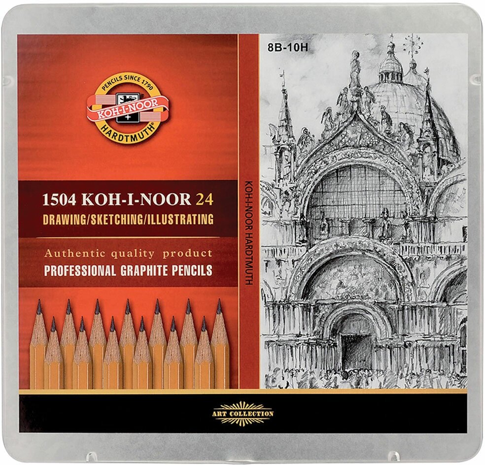 Высококачественные профессиональные чернографитные карандаши, заточенные. В набор входят 24 карандаша всех типов твердостей 8B-10H. Набор предназначен в первую очередь для художников и инженеров, но может использоваться любителями рисования и студентами. Карандаши упакованы в металлический пенал.