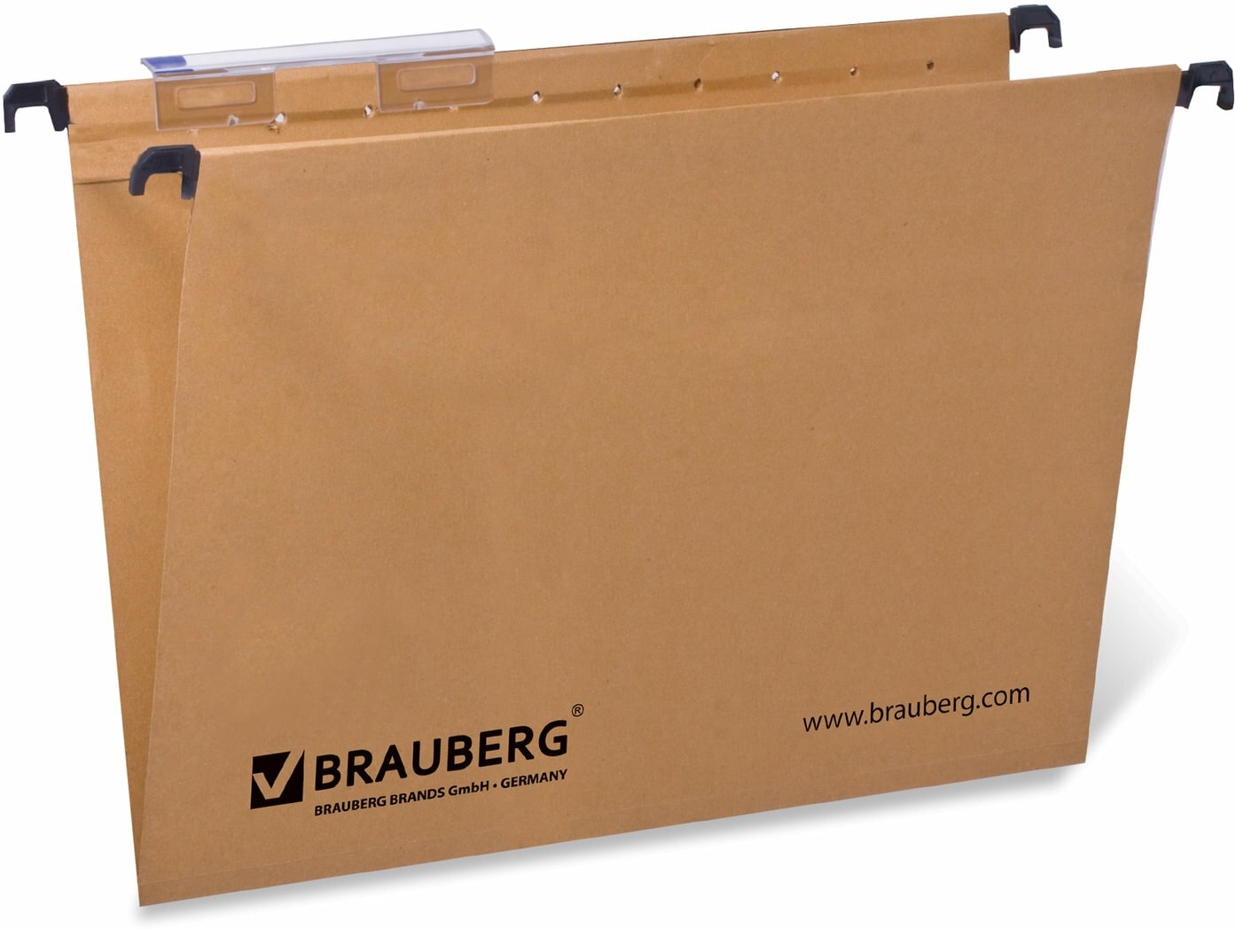 Папки V-образной формы изготовлены из высококачественного картона коричневого цвета плотностью 220 г/м2 и обладают повышенной прочностью. Вмещают до 80 листов. Размер папки без крючков составляет 315х245 мм, с крючками — 350х245 мм. В комплект входят 10 папок, а также 10 прозрачных пластиковых табуляторов с ярлычками шириной 65 мм.