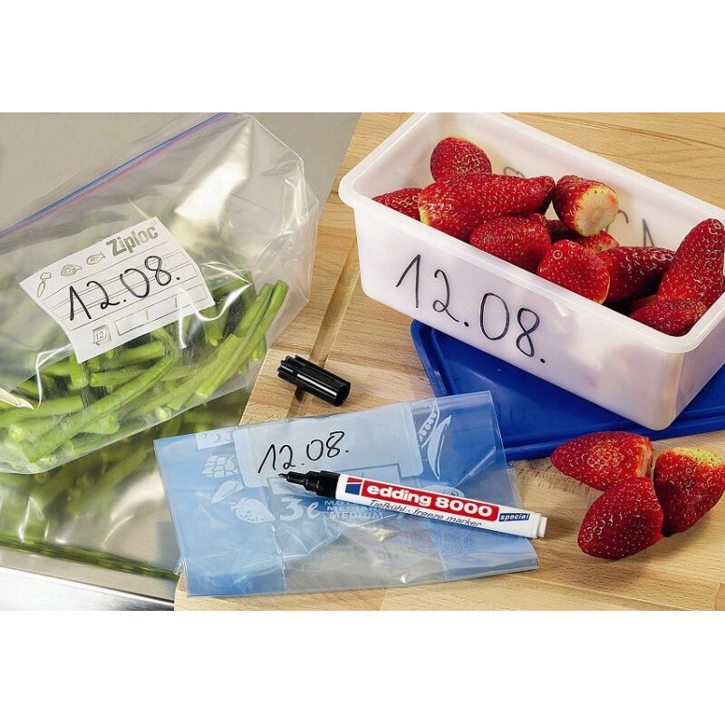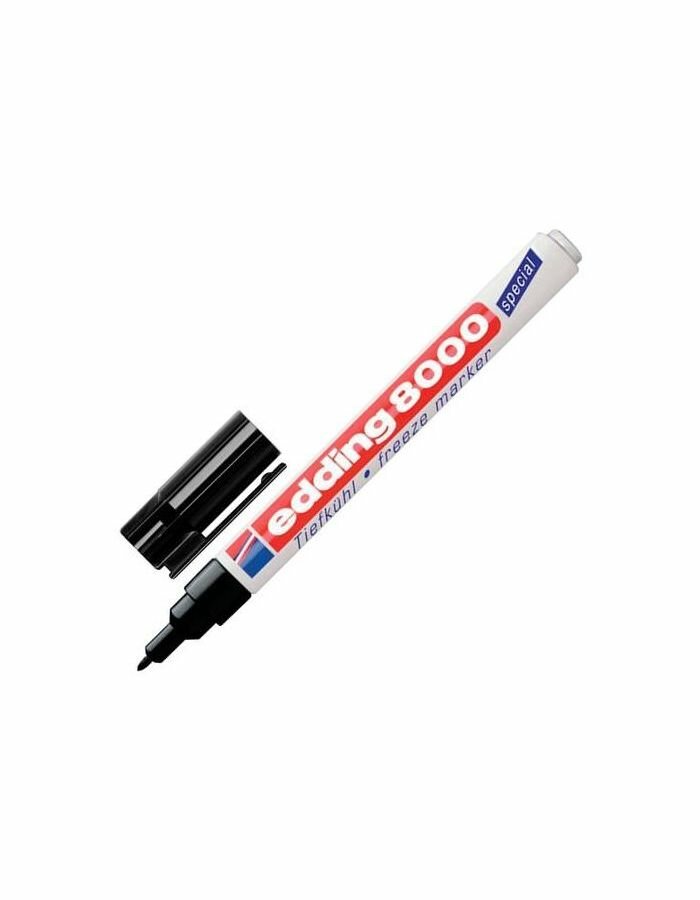 Маркер промышленный Edding E-8000/1 для холодных поверхностей черный (1 мм) используется для нанесения надписей, подверженных замораживанию. Предназначен для маркировки и письма на пакетах, контейнерах для замораживания. Тонкий наконечник позволяет делать надписи на контейнерах даже маленького размера. Перманентные, быстросохнущие и морозоустойчивые чернила без добавления толуола и ксилола устойчивы к морозу, не замерзают и не густеют при контакте с холодной поверхностью и при эксплуатации в условиях пониженных температур. Чернила не проступают сквозь пакет для замораживания. Надписи устойчивы к температуре до ?25 C, также устойчивы к выгоранию и не осыпаются при длительном хранении. Маркер для низких температур также подходит для работ по бумажным материалам, по сухому дереву, картону, пластику. Корпус маркера Edding E 8000/1 изготовлен из прочного пластика, что также упрощает его эксплуатацию в условиях пониженных температур. Пишущий узел маркера оснащен пулевидным наконечником. Внимание! Маркер Еdding 8000 не предназначен для письма на абразивных и сильно загрязненных поверхностях.