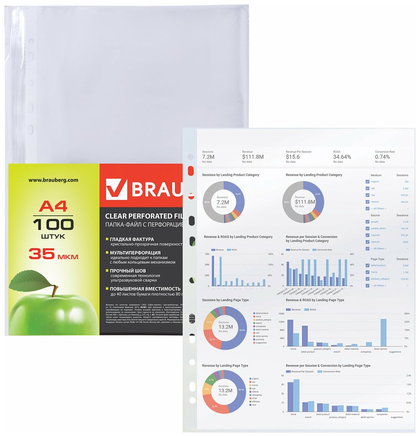 | Прочие особенности и свойства | Папка-файл перфорированная BRAUBERG подходит для подшивки документов в папки с любым кольцевым механизмом и скоросшивателем.,Толщина пленки:35 мкм,Ориентация:вертикальная,Количество в комплекте |