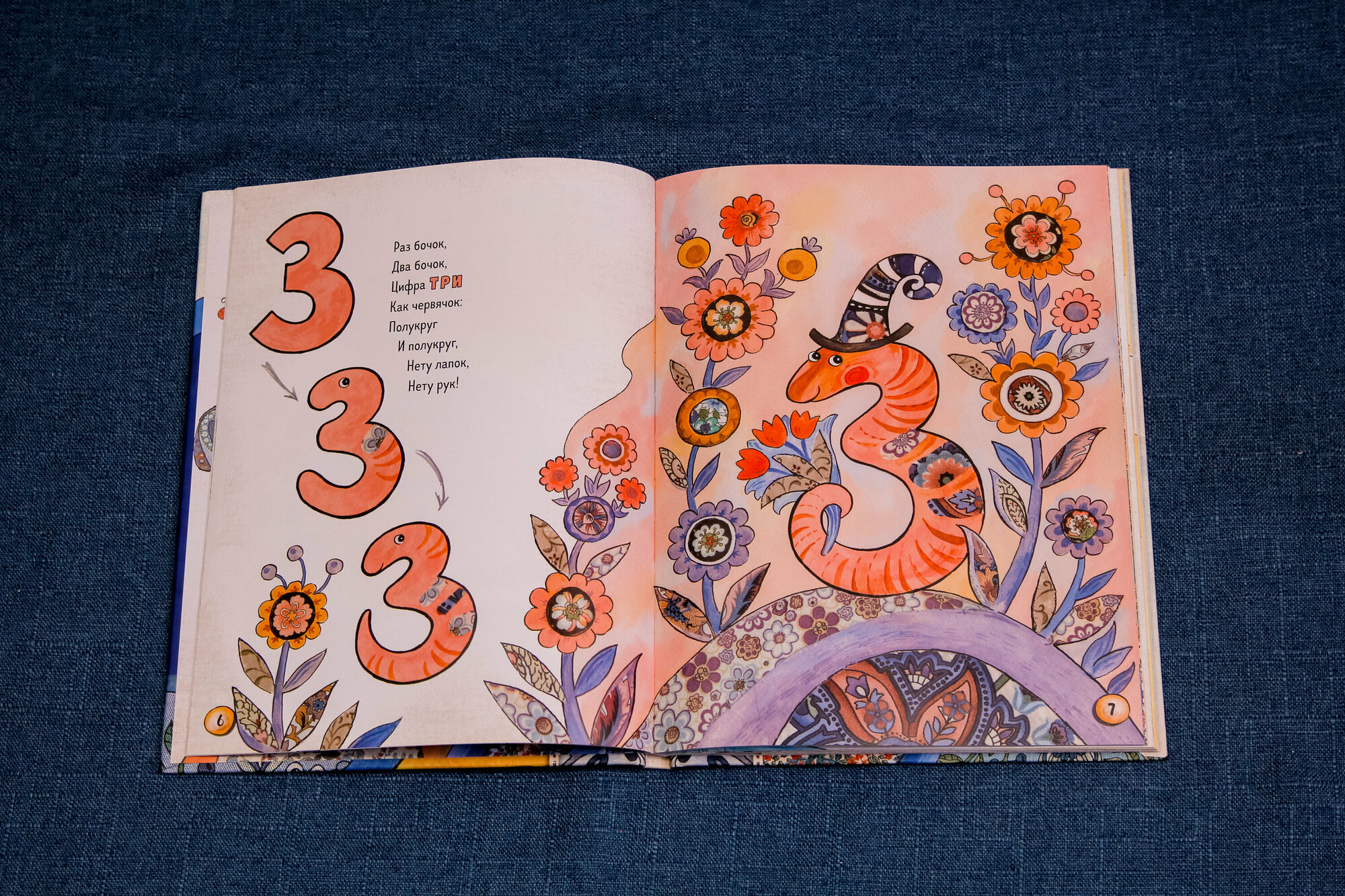 Замечательный детский интерактив, очень продуманный и красочный. Восхитила тщательная проработка оформления, мягкая бархатная обложка и необычные иллюстрации внутри, которые работают с текстом наравне. Цифры превращаются в узнаваемые образы, кошек, рыбок, птиц, которые легко запоминаются. Отдельно так же порадовало приложение в конце книги: несколько листов с цифрами-раскрасками и листы-вырезалки с фигурками разных милых животных, которое оказалось очень полезным для закрепления знаний. Так что приобретением довольна)