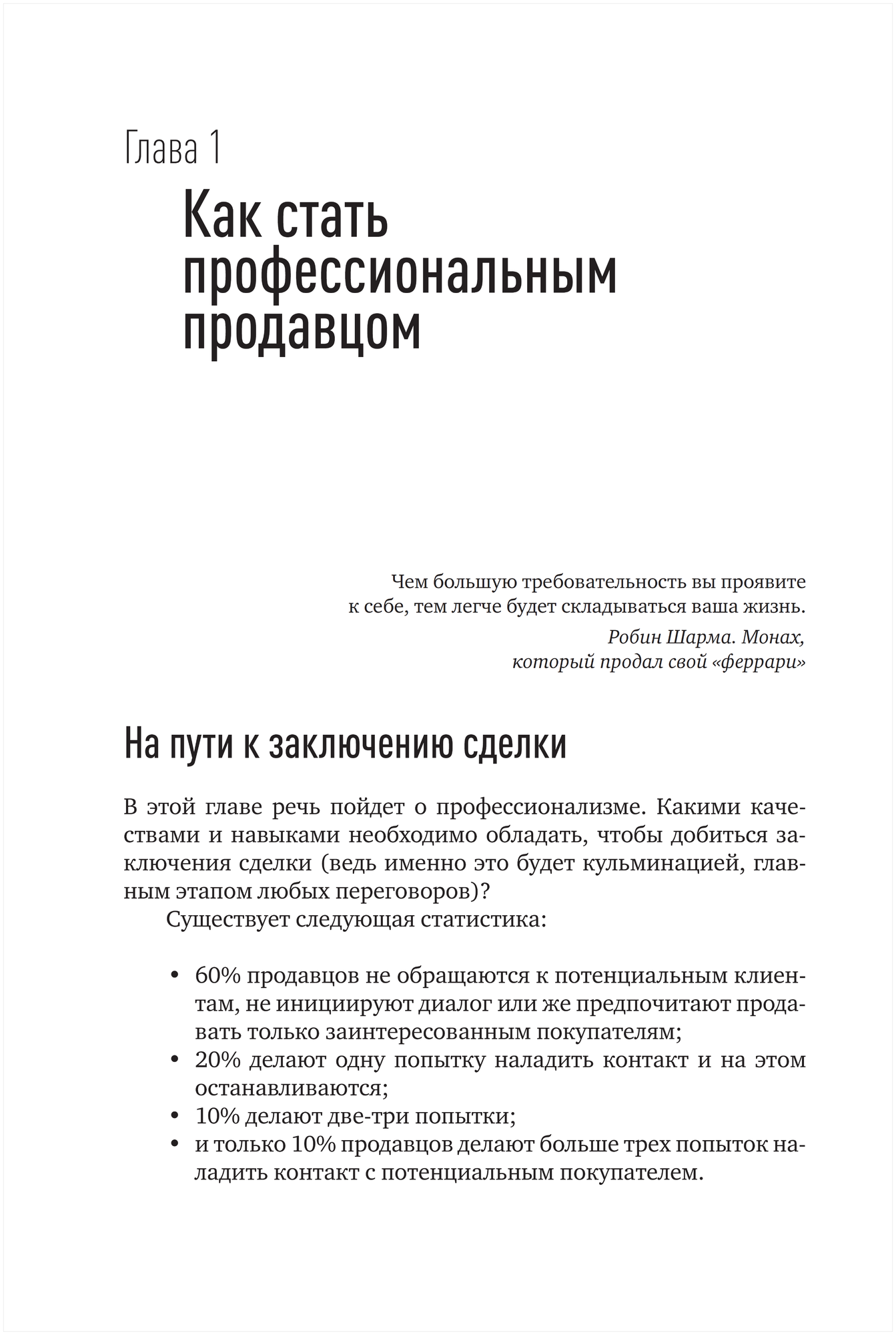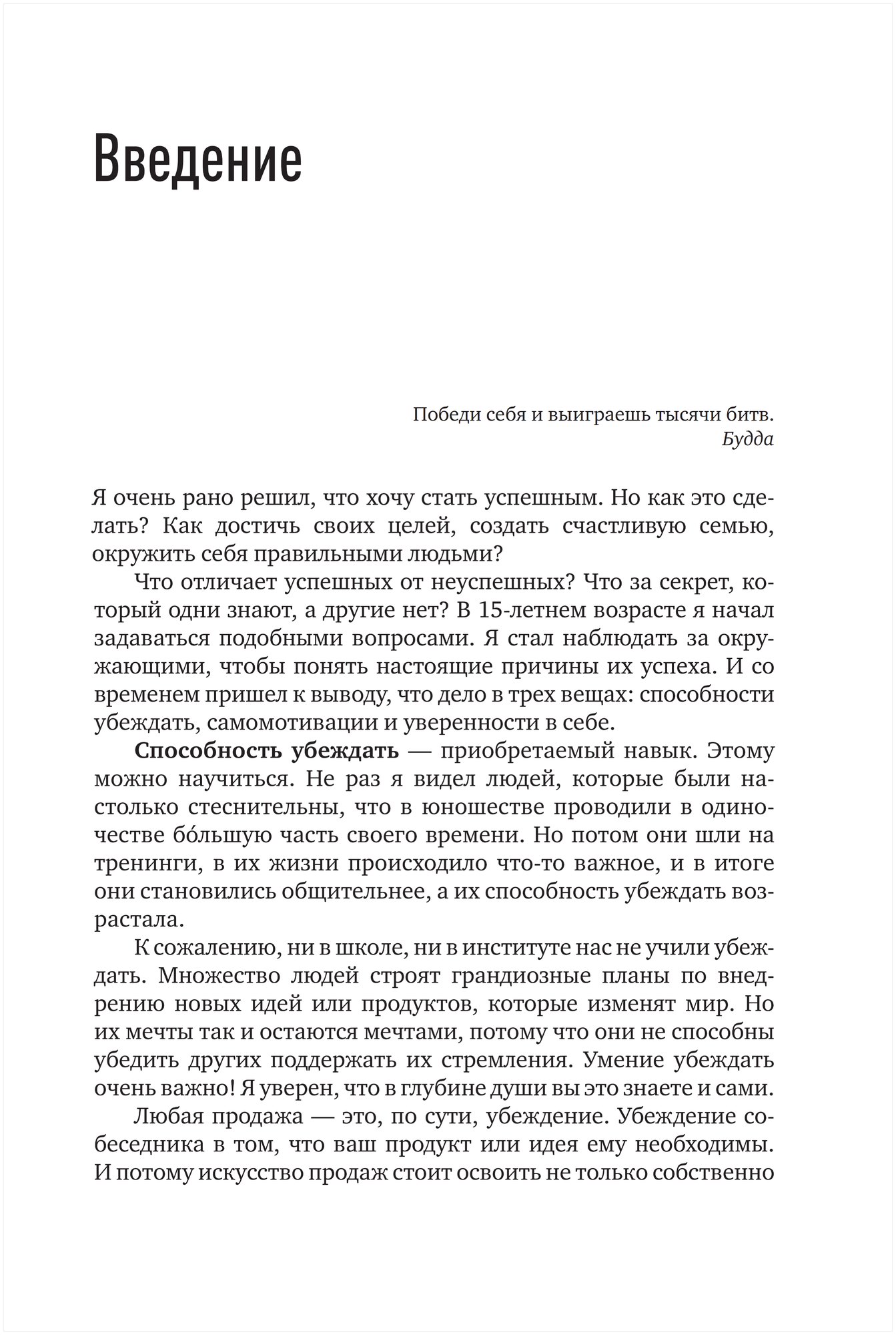 Цель этой книги — не рассказать об отдельных приемах, а помочь приобрести универсальный навык, который выручит менеджера по продажам в любой ситуации, — способность убеждать. Ведь сколько бы приемов вы ни изучили, их все равно будет недостаточно для того, чтобы подходящий нашелся для каждого случая.