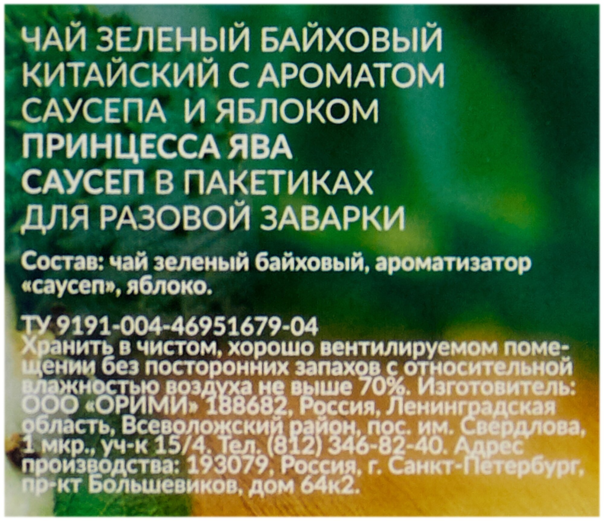Описание товара:Чай Принцесса Ява Саусеп – зеленый листовой чай с изысканным ароматом саусепа в удобном формате для разового заваривания.Состав товара:Чай зеленый байховый, ароматизатор "Cаусеп", яблоко.