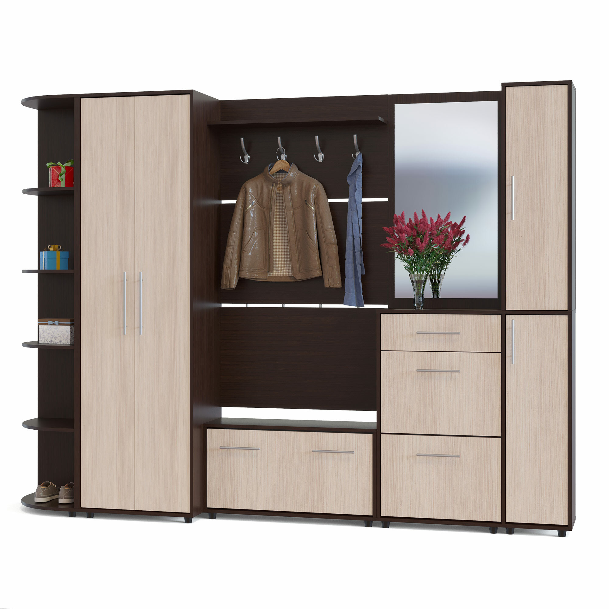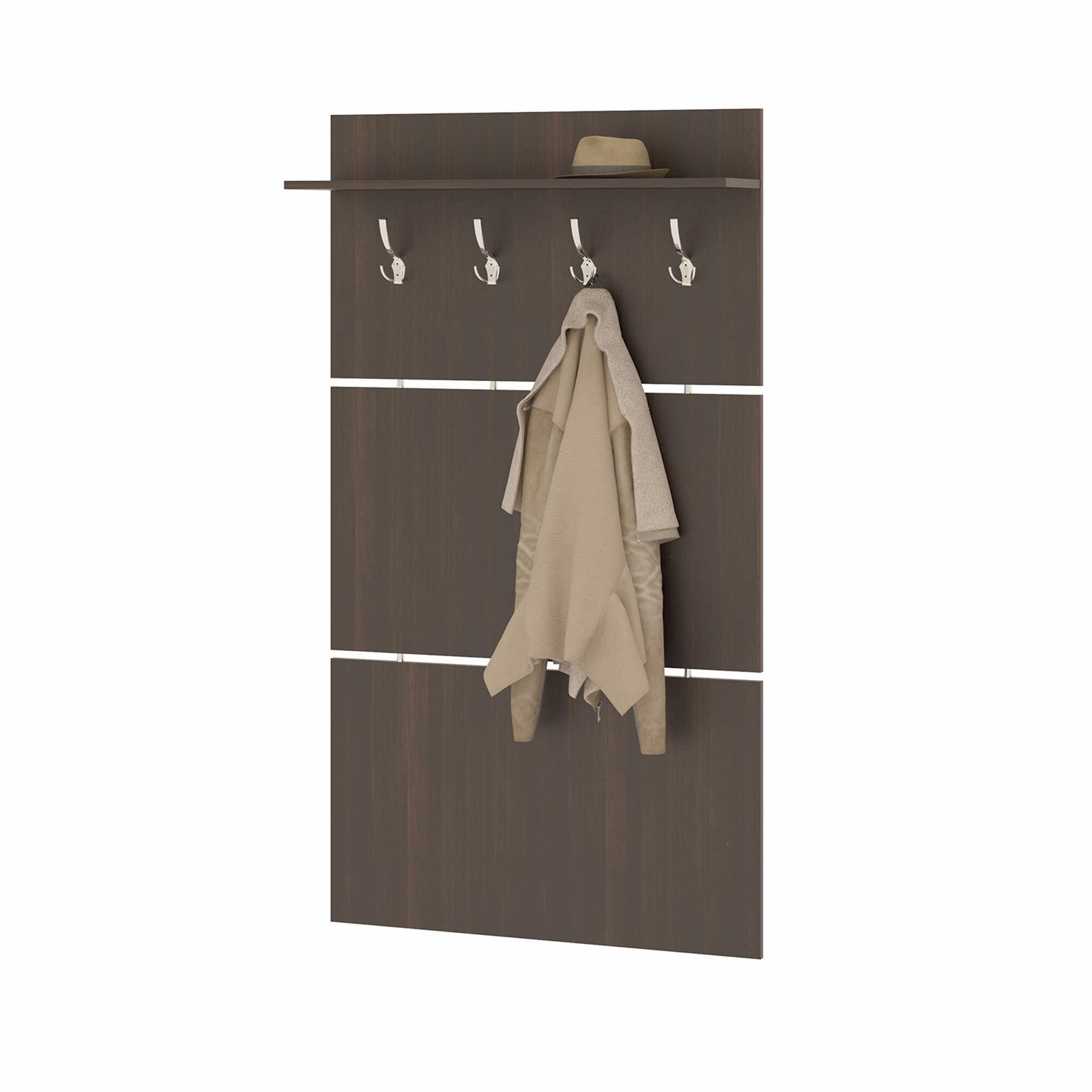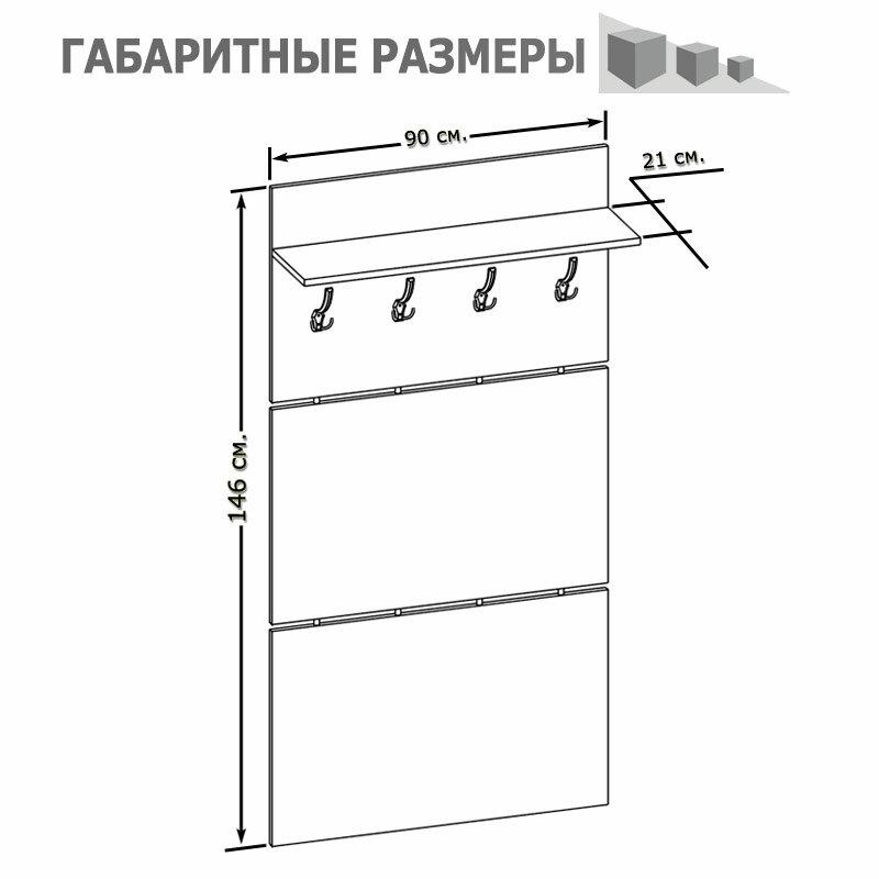 Габаритные размеры ВхШхГ 1460x900x212 мм. Широкая навесная вешалка Моренго позволит разместить сезонную одежду всей семьи. Модель состоит из трех панелей, соединенных металлическими вставками. На верхней панели располагается четыре трехрожковых крючка для одежды. Полка, закрепленная над крючками, предназначена специально для головных уборов и зонтов.