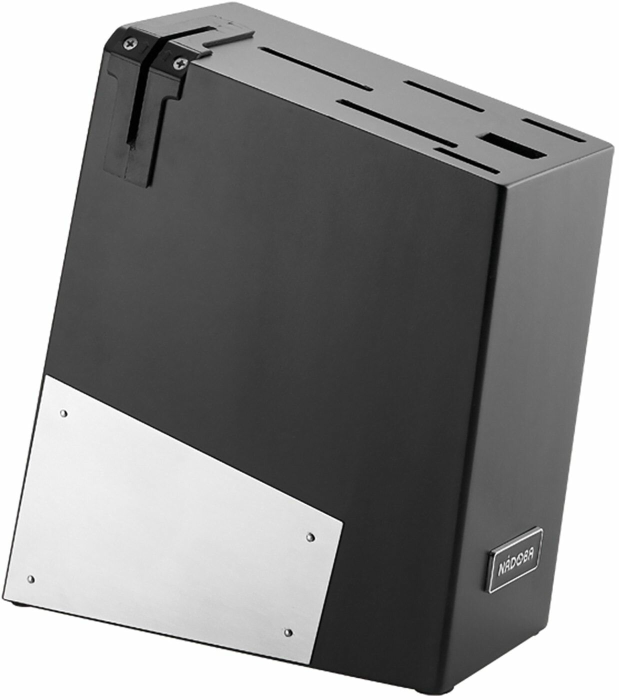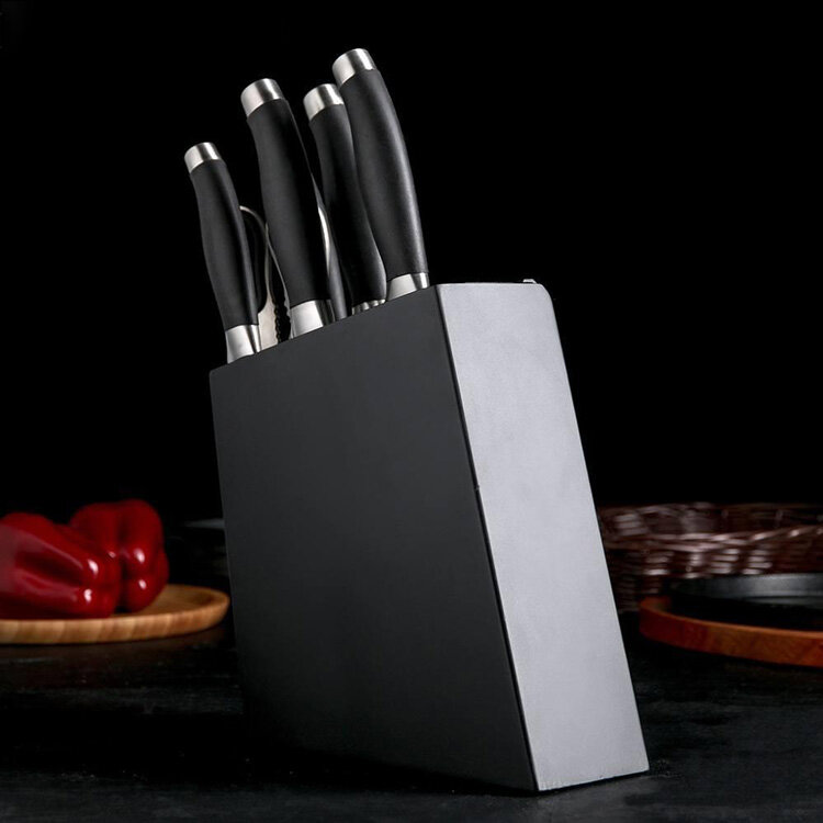 | Набор включает | нож для овощей, 10 см.; нож универ-сальный, 12,5 см.; нож разделочный, 20 см; нож Сантоку, 17,5 см.; нож поварской, 20 см.; ножницы кухонные c открывалкой для бутылок; деревянный блок для ножей (гевея, чёрный) c ножеточкой. |