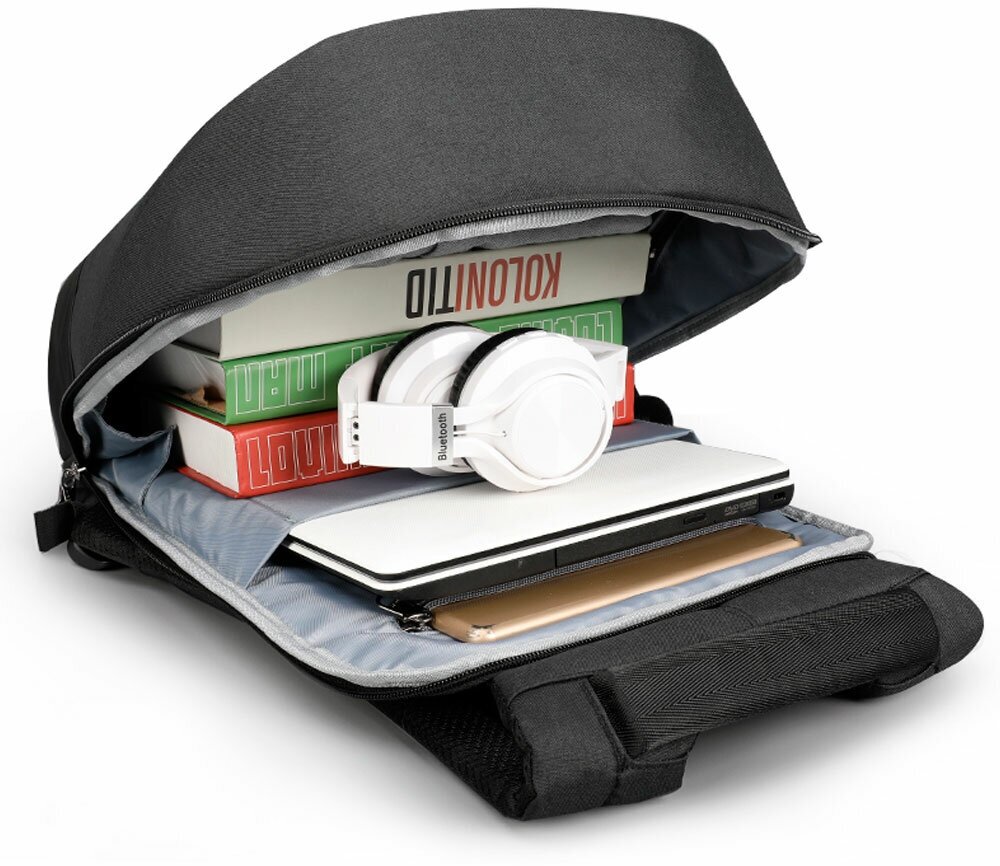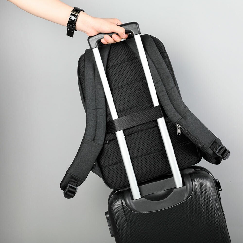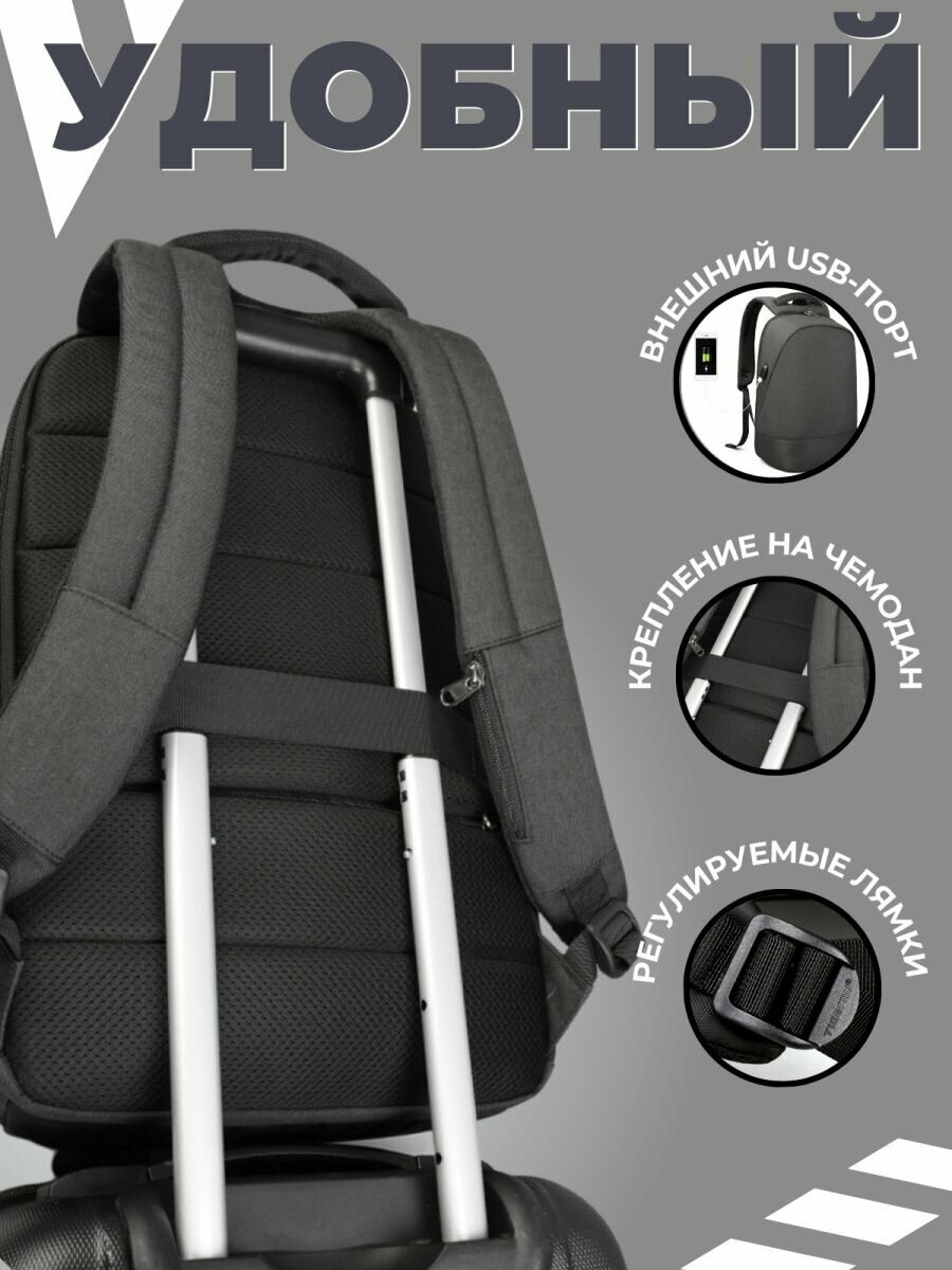 Имеет водоотталкивающее покрытие, дышащую ортопедическую спинку, удобную ручку для переноски, мягкие и регулируемые по длине лямки, которые сделают переноску любых вещей максимально комфортной. Модель оснащена крепежной лентой для перевозки рюкзака на ручке дорожной сумки. Также здесь предусмотрен USB-порт для экстренной подзарядки гаджетов на ходу. Все отделения закрываются на двусторонние надежные молнии с фирменными бегунками.