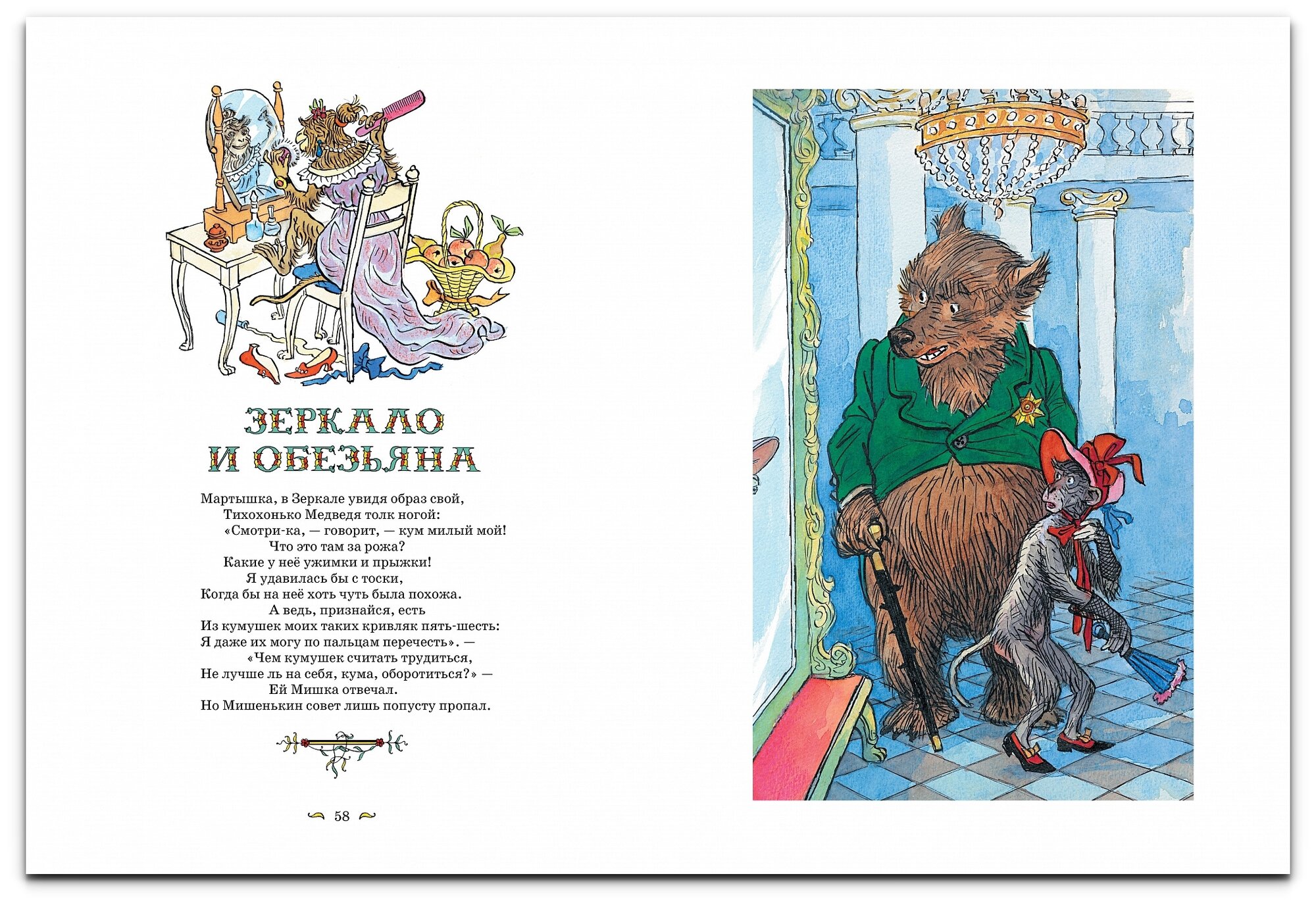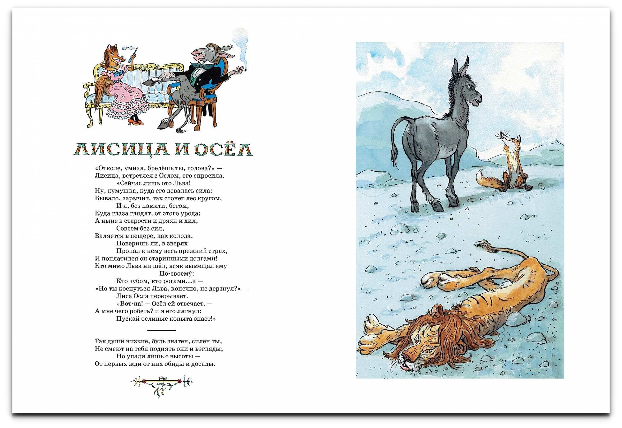 Выбирала между двумя сборниками басен – от издательства «Речь» с рисунками Рачёва и этот, с рисунками Семёнова. У «Речи» в сборнике больше басен, но ужасная, сумбурная верстка, неприятная даже для взрослых, в этом издании басен меньше, но как же хорошо они оформлены. Одна басня на разворот с иллюстрацией, заголовки сделаны декоративным шрифтом и больше никаких украшательств. Читается легко даже ребенком. А ведь жанр непростой, но в этом издании ничто не отвлекает, ничто не мешает восприятию. В общем, я решила, что лучше меньше, да лучше и приобрела этот сборник. Сама книжечка тяжеленькая, крепенькая, приятно держать в руках. Спасибо издательству!