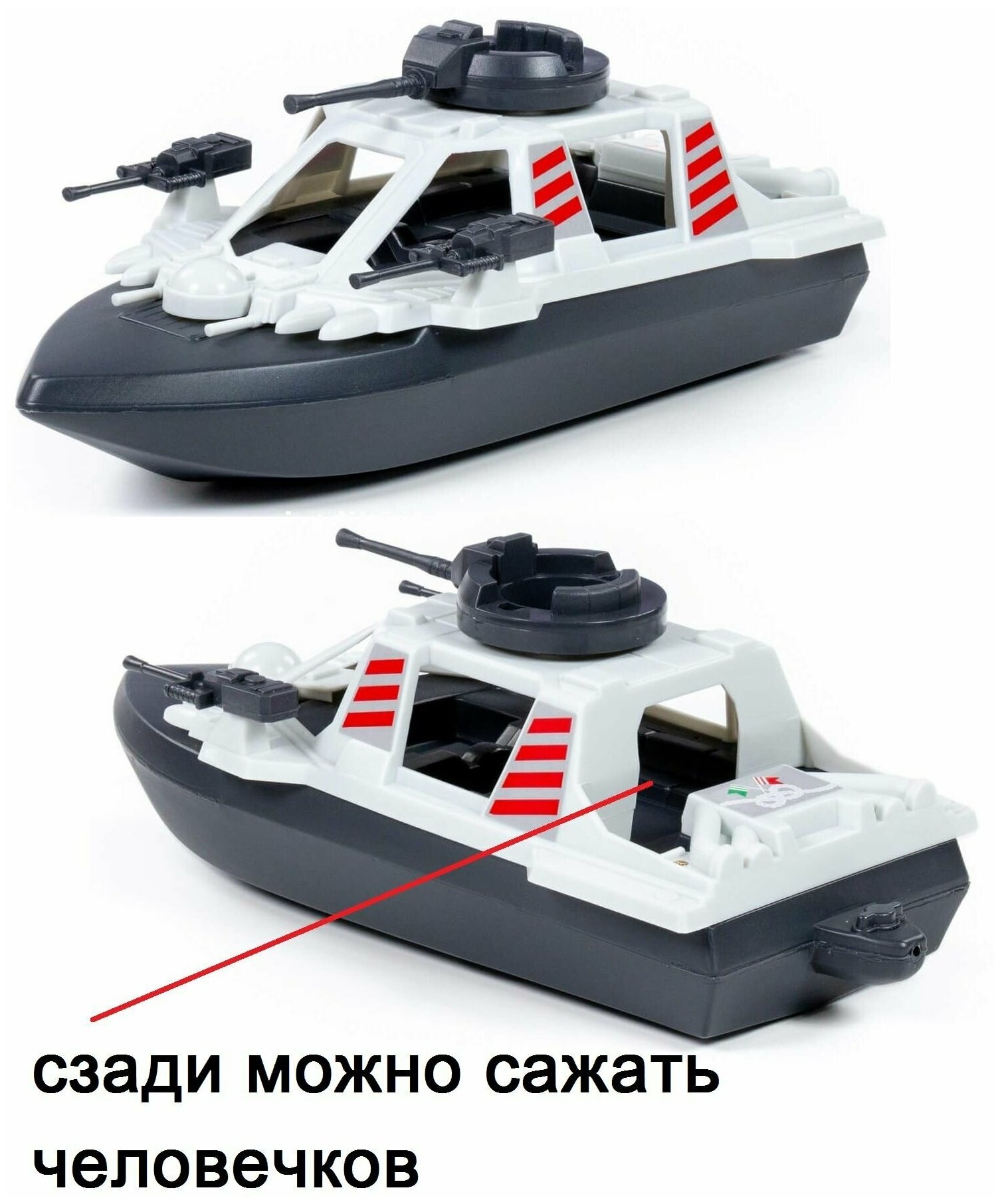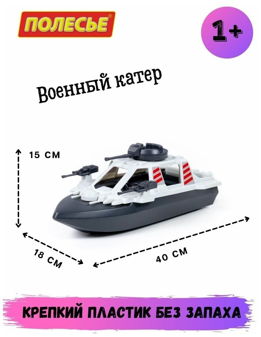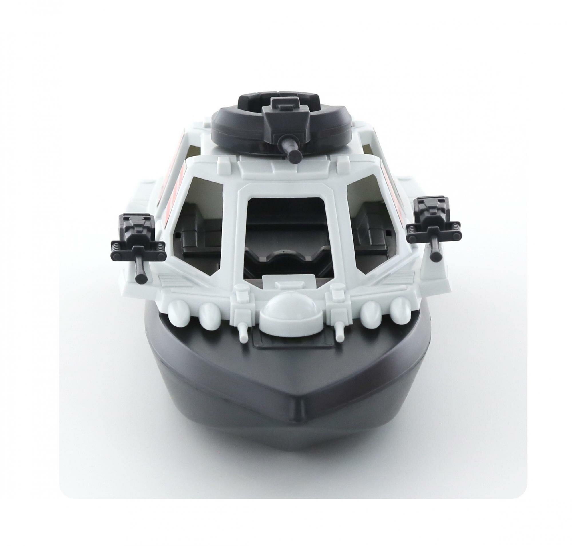 Игрушка изготовлена из легкого, прочного, высококачественного пластика, окрашенного при помощи нетоксичных пищевых красителей.Катер сделан по современной итальянской технологии, по лицензии торговой марки Cavallino Giocattoli.Игрушечный катер упакован в прочную пластиковую сеточку с фирменной этикеткой, в которой содержится подробная информация об игрушке.Игрушка отлично держится на водной поверхности, не имеет запаха пластмассы, благодаря тщательно запаянным швам вода не проникнет внутрь изделия.На крыше и по бокам кабины установлены три подвижные, вращающиеся пушки, на верхней пушки есть место с сидением для пулеметчика, куда можно посадить игрушечную фигурку.Еще одно пассажирское место имеется в кабине катера, где расположен штурвал.На поверхности катера находится множество деталей военной техники и светоотражающие элементы.Грозный катер с впечатляющим внешним видом, полной экипировкой и боевой раскраской понравится любому мальчишке.Детям интересно будет играть с ним в воде: в ванной, в бассейне, на отдыхе с родителями у водоема и т. д.Даже если воды рядом нет, ребята наверняка придумают с катером множество интересных «сухопутных» игр. цвета — черный, белый; страна — Беларусь, размер в собранном виде (ДхШхВ) — 40,3-18-14,5 см,материал — пластик,упаковка — пластмассовая сеточка,вес (в упаковке) — 0,45 кг.