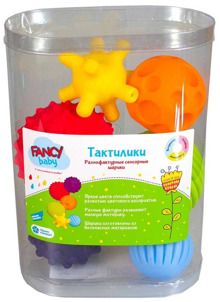 Тактилики" - отличная развивающая игрушка для детей от Fancy Baby. Она представляет собой 6 мягких шариков разной фактуры и формы. Всевозможные выпуклости, рельефы пробуждают в малыше любопытство и интерес, стимулируя его сжимать мячики, которые очень приятны на ощупь. При сжатии, шарики пищат. С игрушками можно даже купаться!