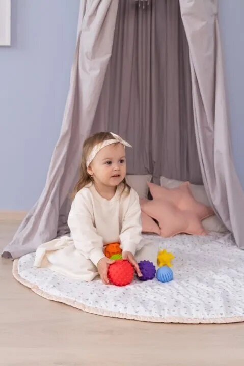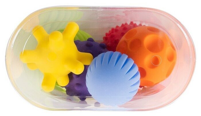 Неплохие шарики, ща счет разных фактур развивают и тренируют моторику. Дала в 5 мес пару шариков из набора один с отростками и пупырышками. Берет в руку и с пупырышками любит грызть. Был небольшой запах, но после мытья мылом и кипятком запаха нет. А хорошая вещь для моторики.
