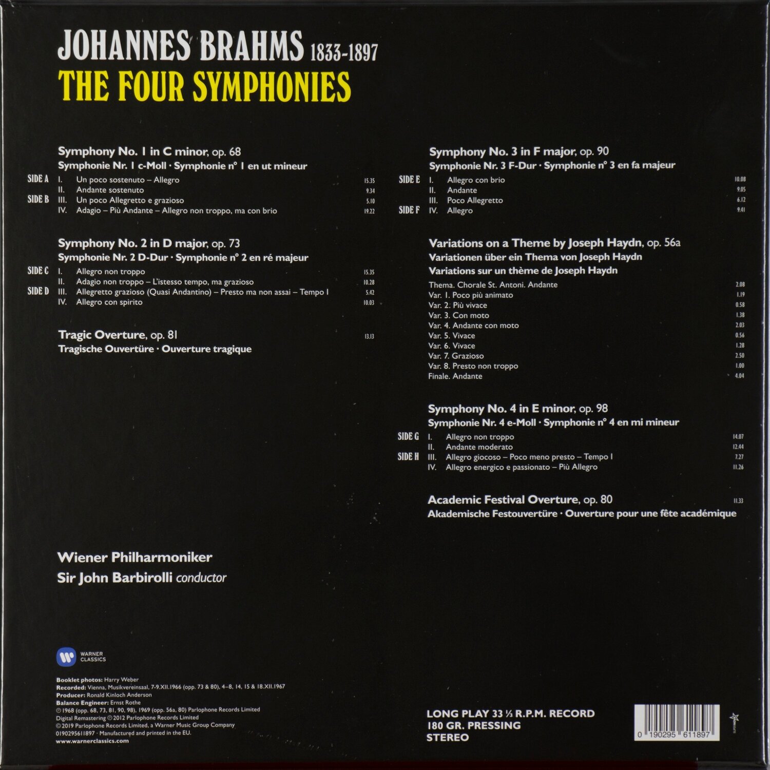 Музыка Брамса занимала важное место в репертуаре Сэра Джона Барбиролли, и эти записи четырёх симфоний, сделанные с Венским филармоническим оркестром в 1966 и 1967 годах, являются одной из вершин его дискографии. Отношения Барбиролли с этой музыкой уходят корнями в его время как оркестрового виолончелиста, и эти выступления отличаются своей богатой, зрелой звучностью и экспансивной теплотой.