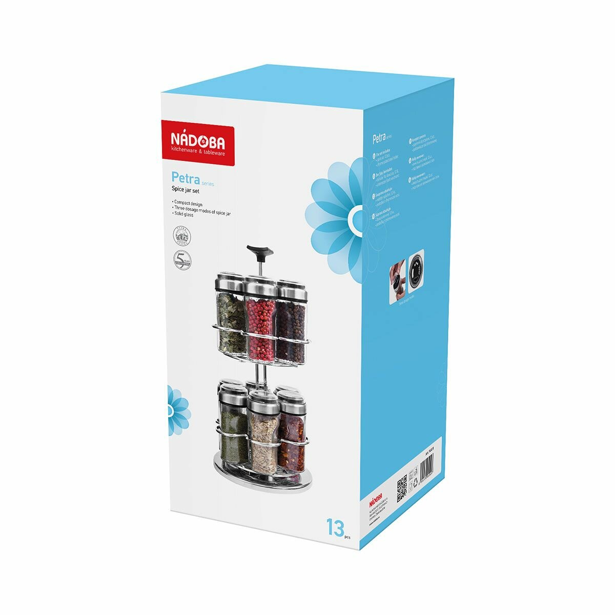 Набор для специй NADOBA Petra состоит из 13 предметов. Емкости изготовлены из высокопрочного стекла, крышки выполнены из нержавеющей стали, пластиковой вставки и силиконового уплотнителя и имеют три различных режима дозирования.
