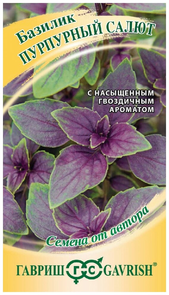 Раннеспелый урожайный сорт базилика с насыщенным гвоздичным ароматом. К массовой уборке зелени приступают через 40-45 дней после появления всходов. Растение очень красивое, высотой 30-40 см, с аккуратной приподнятым розеткой, диаметром 22-25 см. Листья среднего размера, яйцевидные, гладкие, зелено-фиолетового цвета. Базилик придает особый аромат традиционным супам и бульонам, это аппетитная и полезная приправа к мясу, рыбе, свежим салатам и утренним сэндвичам. Благодаря декоративным качествам, кустик Пурпурного салюта, пересаженный в горшок, станет украшением кухонного интерьера. Выращивают рассадным способом или прямым посевом в открытый грунт. Посев на рассаду производят в конце марта - начале апреля. Посев в грунт - в мае или начале июня. Высадка рассады в грунт - начало июня. Схема посадки: 30x30 см. Предпочитает хорошо структурированные, богатые гумусом почвы. Нуждается в регулярных поливах.