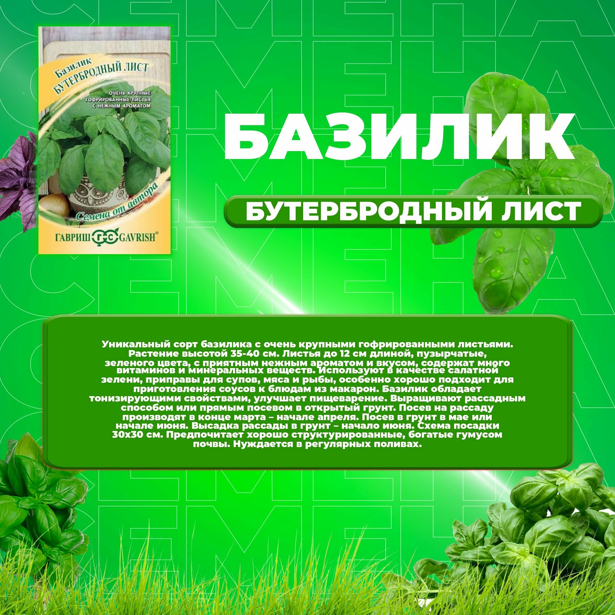 Уникальный сорт базилика с очень крупными гофрированными листьями. Растение высотой 35-40 см. Листья до 12 см длиной, пузырчатые, зеленого цвета, с приятным нежным ароматом и вкусом, содержат много витаминов и минеральных веществ. Используют в качестве салатной зелени, приправы для супов, мяса и рыбы, особенно хорошо подходит для приготовления соусов к блюдам из макарон. Базилик обладает тонизирующими свойствами, улучшает пищеварение. Выращивают рассадным способом или прямым посевом в открытый грунт. Посев на рассаду производят в конце марта - начале апреля. Посев в грунт в мае или начале июня. Высадка рассады в грунт - начало июня. Схема посадки 30x30 см. Предпочитает хорошо структурированные, богатые гумусом почвы. Нуждается в регулярных поливах.