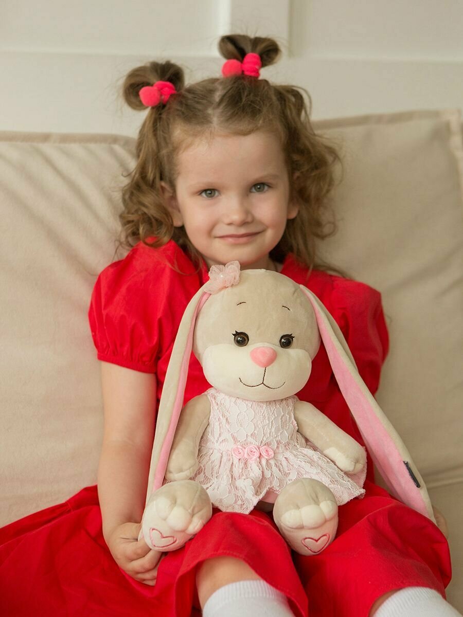 Наша зайка – сама нежность! Красавица с шерсткой молочного цвета, длинными розовыми ушками и милейшим розовым носиком, ждет друзей на чаепитие с зефирками.