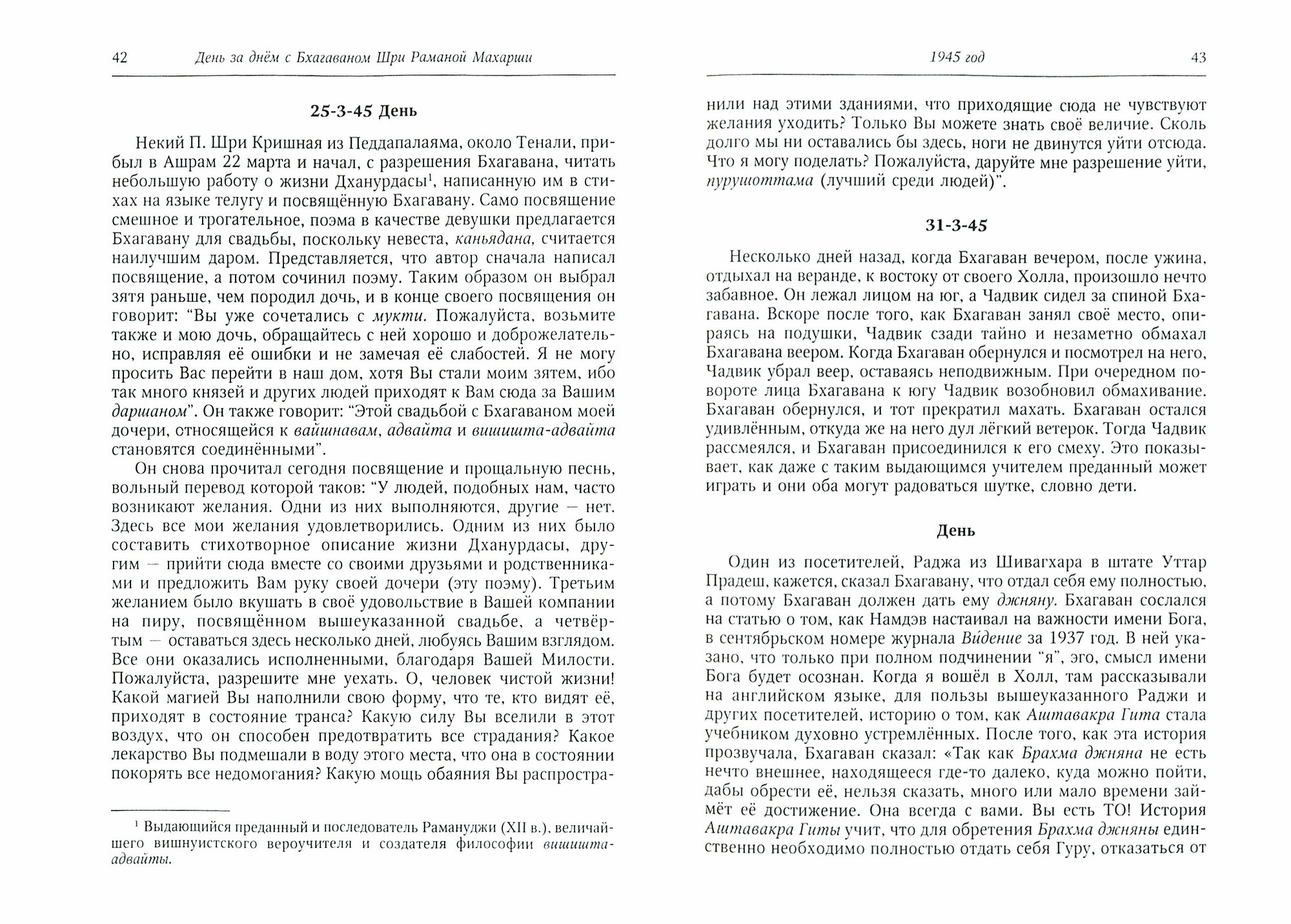 "День за днём" - выдержки из дневника, который почти два года (март 1945 - январь 1947) вёл А. Дэвараджа Мудалияр, один из ближайших учеников Махарши. Его записи содержат не только ответы Бхагавана на множество вопросов почитателей и посетителей, но рисуют также его человеческий и духовный портрет. Работая с этим дневником, духовный искатель погружается в глубины Мудрости, излучаемой живым присутствием Махарши и в атмосферу жизни Его ашрама. Перед читателем проходит вся жизнь Бхагавана, начиная с детских лет, озвученная им и рассказанная близкими к нему духовными искателями. В русском переводе публикуется впервые.