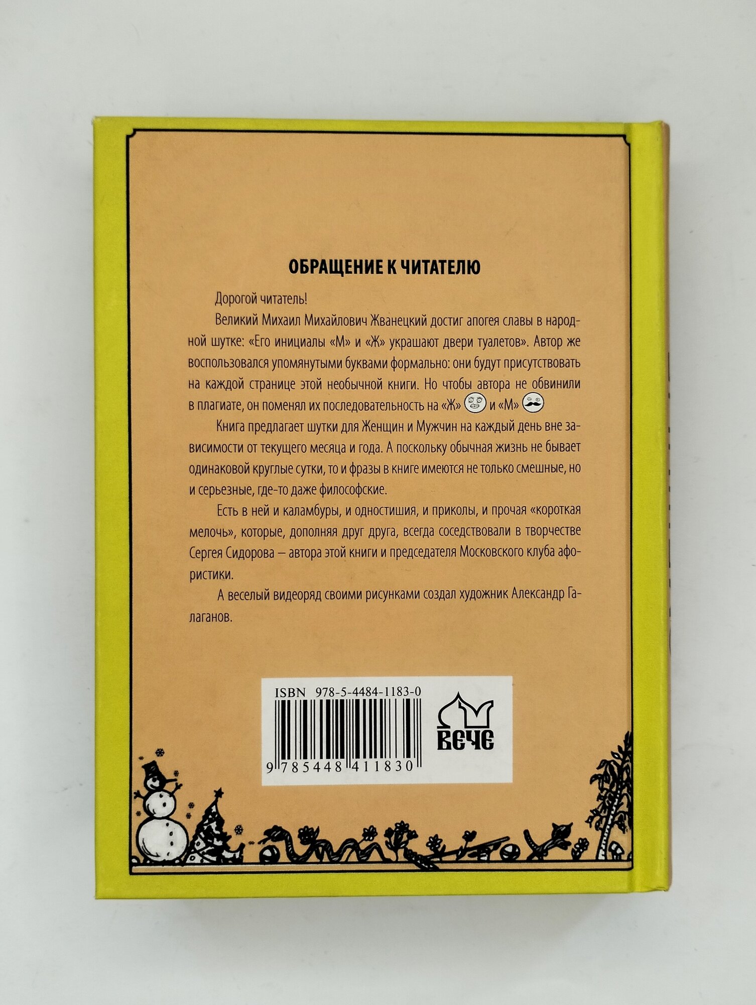 Великий Михаил Михайлович Жванецкий достиг апогея славы в народной шутке: "Его инициалы "М" и "Ж" украшают двери туалетов". Автор же воспользовался упомянутыми буквами формально: они будут присутствовать на каждой странице этой необычной книги. Но чтобы автора не обвинили в плагиате, он поменял их последовательность на "Ж" и "М".