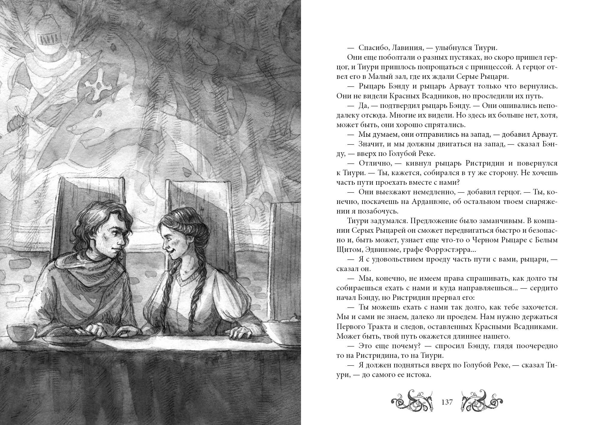 "Тиури закрыл глаза и тут же открыл их снова, хотя от этого мало что переменилось. Потом положил руку на грудь, ощупал письмо и вдруг подумал, что миссия, возложенная на него, невыполнима. Черного Рыцаря с Белым Щитом убили Красные Всадники. Неужели он, молодой и неопытный, сумеет справиться с задачей, оказавшейся не под силу отважному рыцарю?"