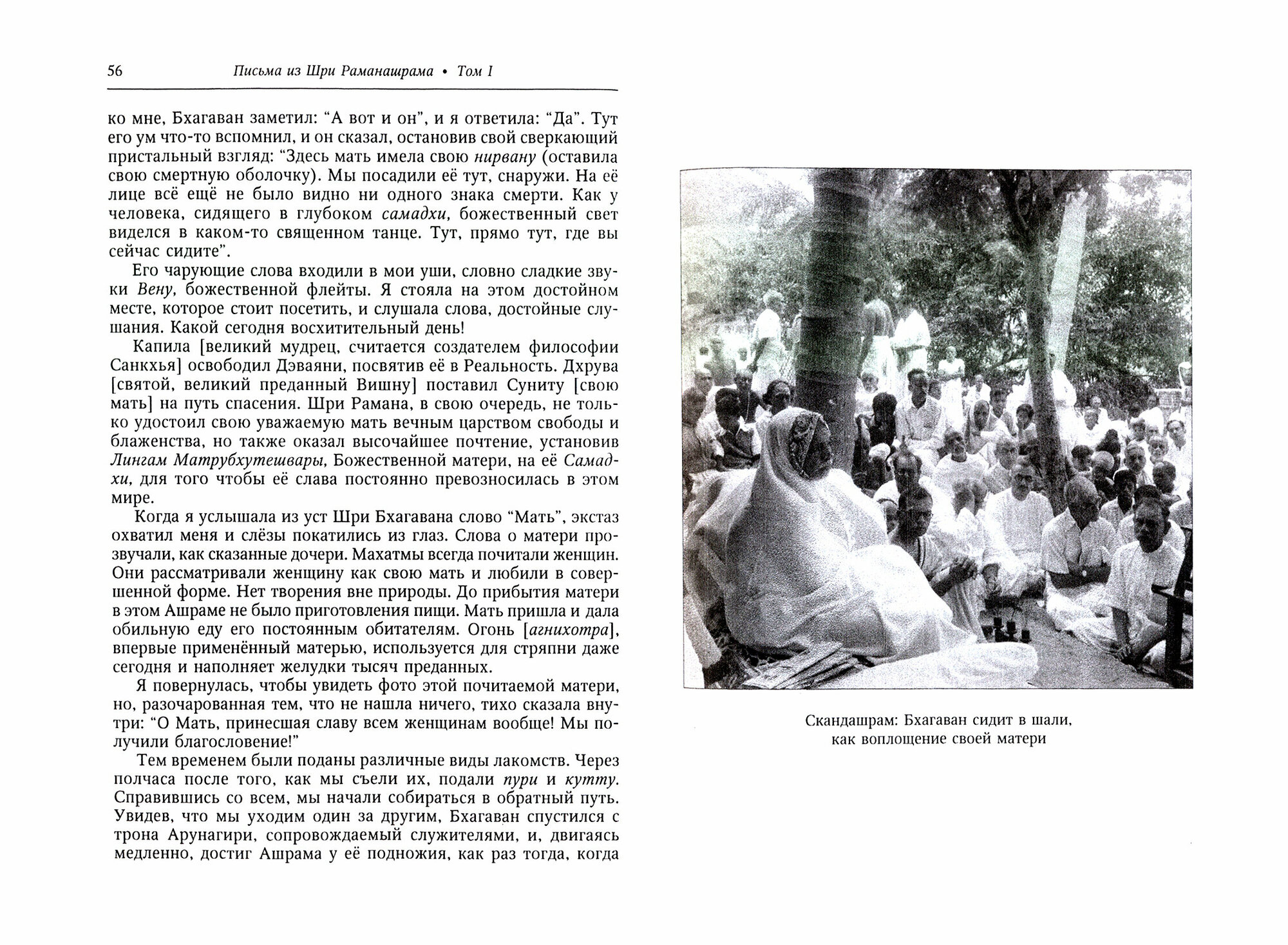 "Письма из Шри Раманашрама" - записи в форме писем на языке телугу своему брату, живущему в Мадрасе, которые последние четыре с половиной года земной жизни Учителя (ноябрь 1945 - апрель 1950) вела Сури Нагамма, молодая ученица Махарши. Она чувствовала непреодолимое стремление записывать всё сказанное Бхагава-ном и всё произошедшее с ним. Эти письма, которые показывались ему до их почтового отправления - достоверный источник информации, представленный в простой и легко понимаемой форме, исполненный бесконечной Любовью к Учителю. Они, безусловно, будут руководить поколениями духовных искателей. В русском переводе публикуется впервые. Русское издание богато проиллюстрировано, содержит пятьдесят прекрасных фотографий.