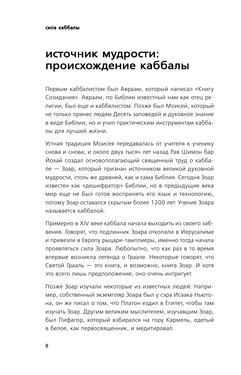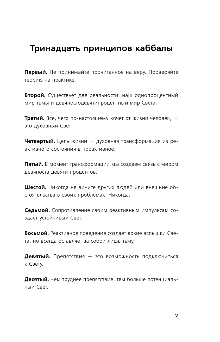 Мировой бестселлер, переведенный на 20 языков. Самая популярная книга о каббале и о ее практическом применении в современной жизни. Тринадцать принципов, приведенных в этой книге, основываются на мудрости, которой более четырех тысяч лет. Применение этих принципов поможет избавиться от хаоса, внутренней борьбы, отчаяния и достичь состояния постоянного счастья, которое и является нашим предназначением. В этом и заключена сила каббалы.