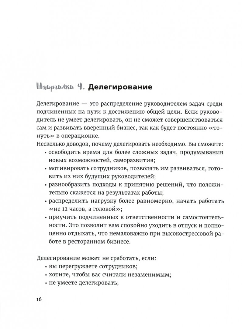 Прочла книгу "57 шпаргалок по управлению рестораном". Мне понравилось, что книга структурирована и не надо перебирать большие главы, чтобы найти ответ на свой вопрос. Четкие ответы по конкретным вопросам гораздо удобнее, чем длинные пространные рассуждения ни о чем. Также понравились интервью со специалистами из ресторанного бизнеса. Они на примерах показывают, что работает, что нет и почему. Вообще, в книге много практики и в этом ее ценность. Теорию можно и в интернете прочитать. Видно, что автор разбирается в ресторанном бизнесе, работает схема "бери и делай". Будет полезна и новичкам, и рестораторам-самоучкам. Наводит порядок в голове.