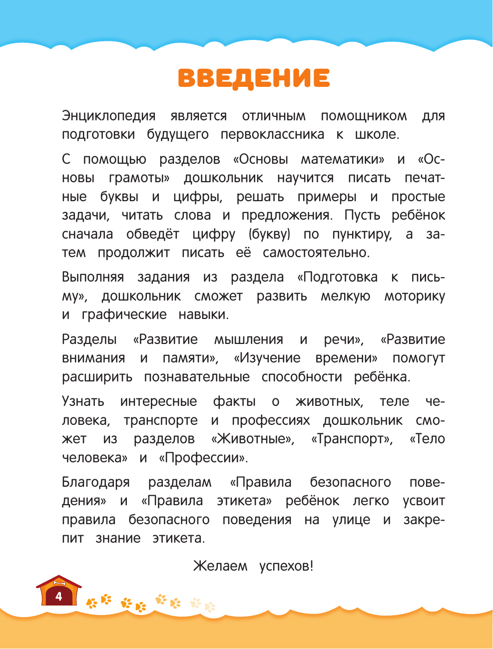 Универсальная энциклопедия включает в себя полный курс подготовки к школе и охватывает основные разделы дошкольного образования: грамота, математика, чтение, подготовка руки к письму, развитие мышления, внимания, памяти, речи, животные, транспорт, тело человека, профессии, время, правила этикет, правила безопасного поведения. Пособие включает в себя интересные факты и занимательные игровые задания, составленные опытными педагогами, и поможет родителям оценить уровень подготовки ребенка к школе и вовремя ликвидировать пробелы в знаниях. А красочные познавательные иллюстрации будут способствовать лучшему усвоению нового материала.