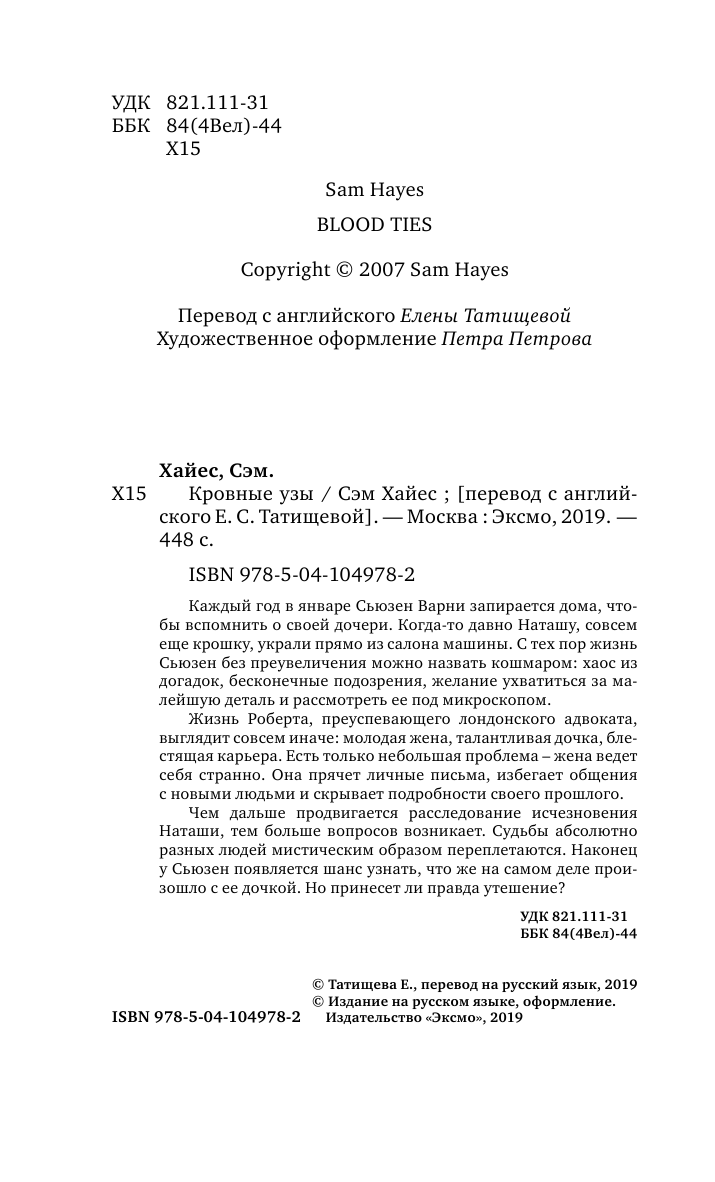 Книга: Кровные узы (Сэм Хайес); Эксмо, Редакция 1, 2019