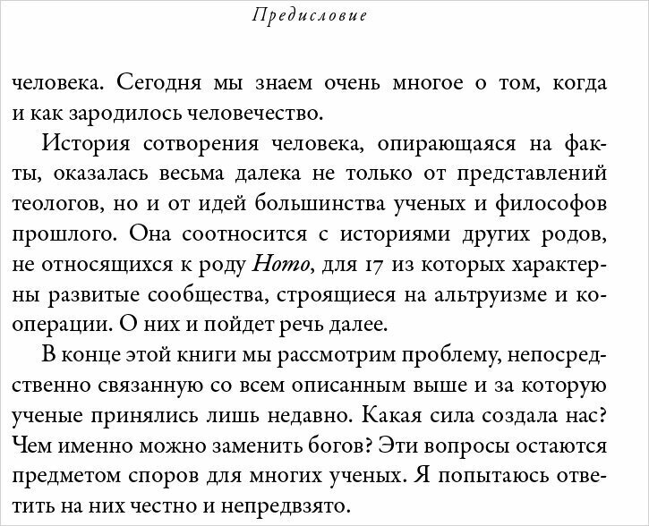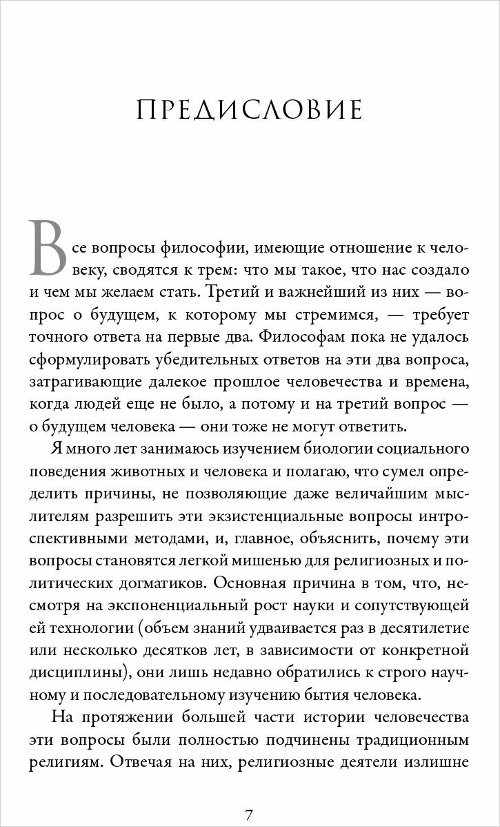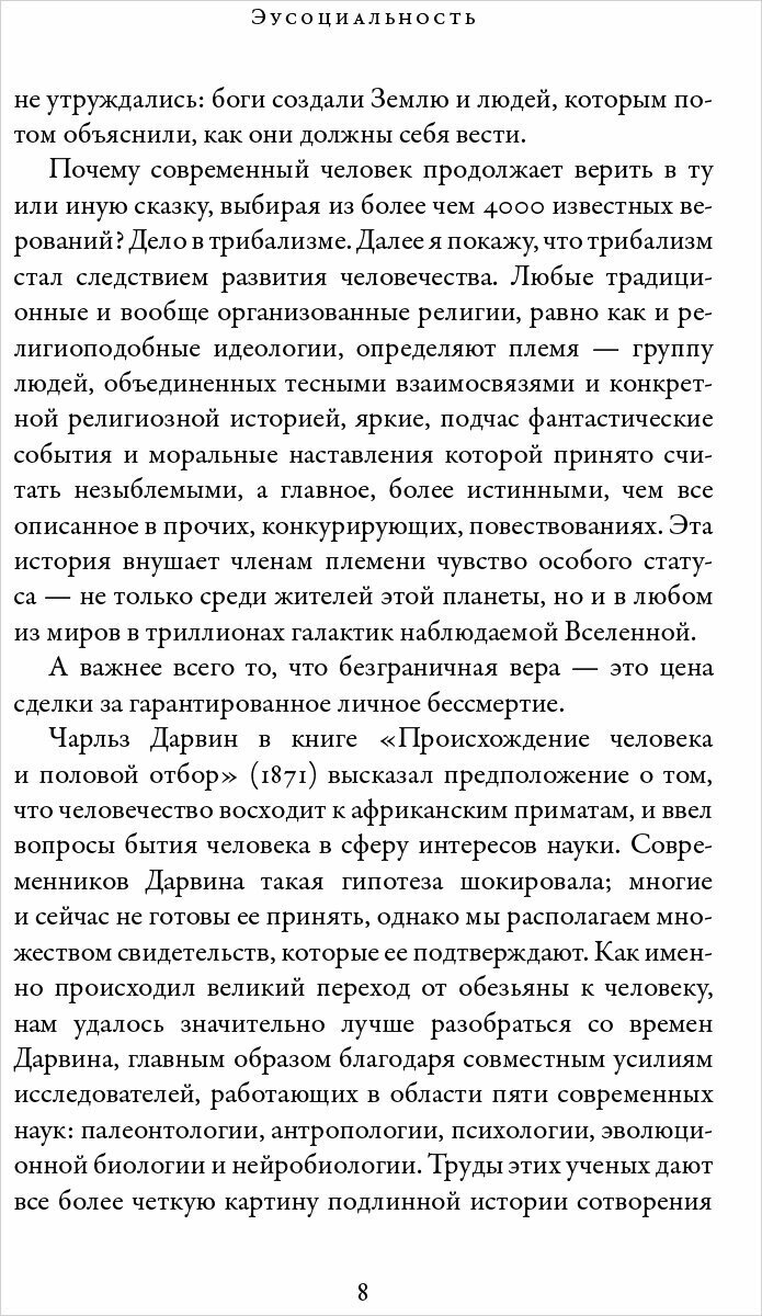 Известный натуралист дает емкое обобщение актуальных научных данных по дарвиновской эволюции и поведению человека История общей социальной эволюции, а также доходчивое и сжатое изложение эволюции человека, уделяющее достаточное внимание использованию орудий труда, повлиявших на рост мозга, но делающее особый акцент на истинном источнике нашего превосходства — способности работать сообща.Kirkus Reviews В своей новой книге Эдвард Уилсон рассматривает шесть "великих эволюционных переходов", которые привели к становлению человеческого общества Удивительно, как ему удается доходчиво объяснить природу этих переходов в столь небольшой книге. Журнал Publishers Weekly Эдвард Уилсон с характерной для него краткостью, ясностью и остроумием, а также непревзойденной способностью к синтезу актуальных научных сведений объясняет в этой работе ни много ни мало происхождение человеческого общества.Ричард Роудс историк, лауреат Пулитцеровской премии Эдвард Уилсон утверждает, что религиозные и философские вопросы можно свести к рассмотрению генетических и эволюционных составляющих, а тело и разум человека имеют физическую основу, подчиняющуюся физическим и химическим законам. "Эусоциальность" показывает, что до конца понять поведение человека можно, лишь изучая эволюционную историю других животных. Уилсон упоминает в книге 17 видов животных, среди которых голые землекопы и обитающие среди губок раки-щелкуны, обладающие развитыми сообществами, основанными на альтруизме и кооперации. Он пишет о комарах-звонцах, которые "танцуют, как акробаты", об анчоусах, сбивающихся в тесные косяки, чтобы походить на гигантскую рыбу, или о социальных группах людей, способствующих процветанию сообщества в целом без очевидной эволюционной выгоды для себя. "Эусоциальность — относительно редкое явление в эволюции жизни на Земле, но оно привело к возникновению наиболее выраженных проявлении личного альтруизма и самых сложных социальных отношении. Эусоциальность обеспечила экологическое господство некоторым сухопутным видам, в частности муравьям, термитам и людям". Цитаты: Миллионы ныне живущих видов — наследники героев, переживших шесть эволюционных переходов, несущие в себе следы эволюции от одноклеточных бактерии до отдельных организмов и — к развитым языковым способностям человека, эмпатии и кооперации. Сейчас мы определенно можем утверждать следующее: все части тела и разум человека имеют физическую основу, подчиняющуюся законам физики и химии. И все они, согласно накопленным нами научным данным, возникли в результате эволюции путем естественного отбора. Ученые уже не рассматривают эволюцию в качестве теории. Она является достоверно установленным фактом. А естественный отбор в ходе случайных мутации — это сила, направляющая эволюцию, что подтверждается полевыми наблюдениями и экспериментами. Примером относительно эволюции был рост мозга у гоминид: с 900 см3 у Homo habilis до 1400 см3 у их потомков — Homo sapiens. Напротив, виды цикад и крокодилов по большинству признаков почти не изменились за последние 100 млн лет. Поэтому их обоснованно называют "живыми ископаемыми. Зачем читать: "Эусоциальность" — краткая, но емкая новаторская работа, включающая не только современные представления об эволюционной теории, но и оригинальные биологические и гуманистические 