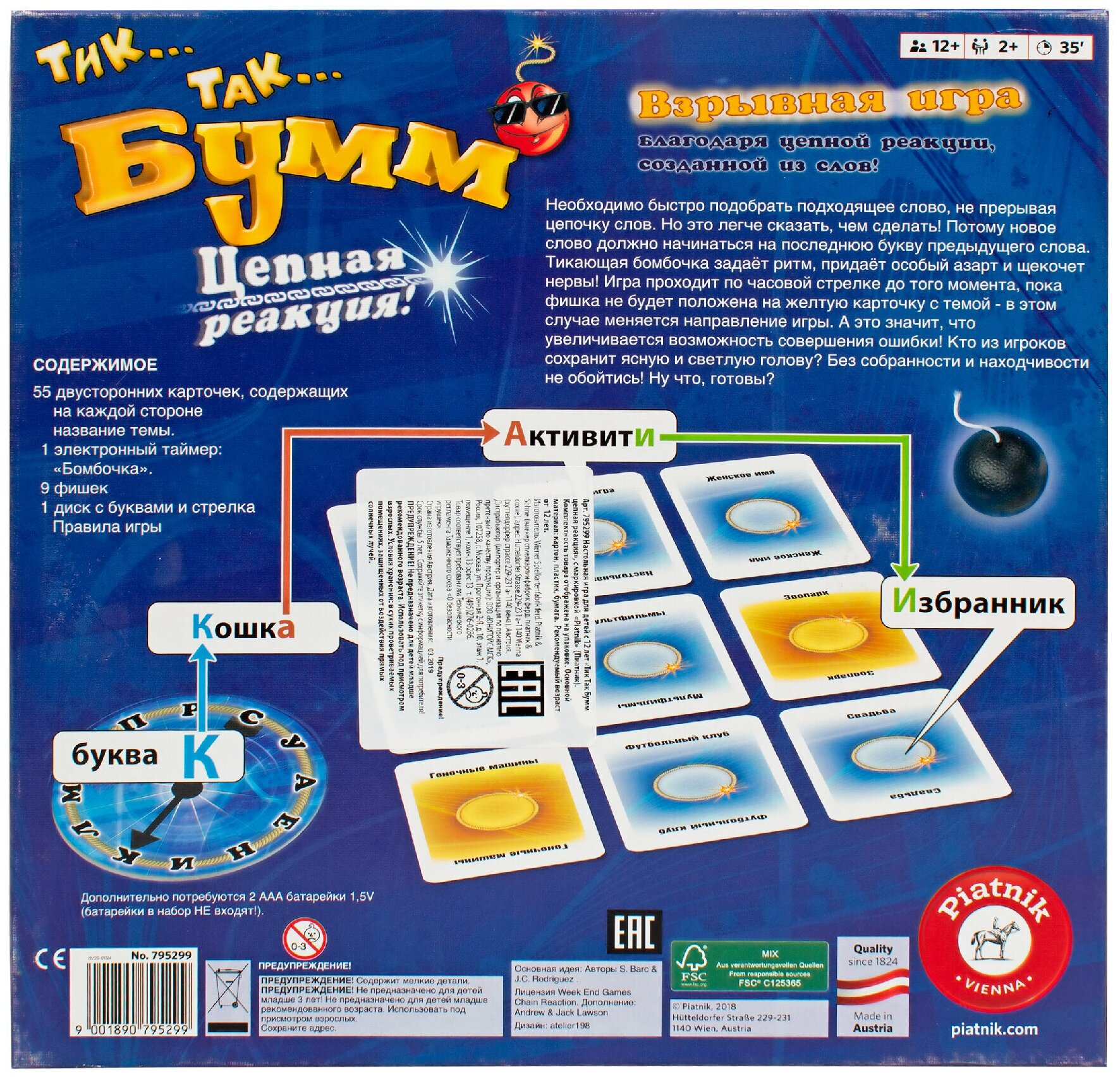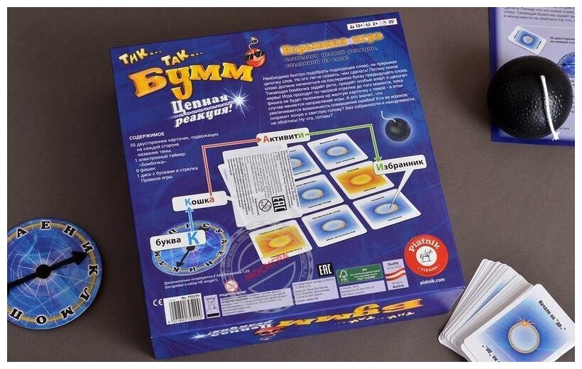 | Комплектация | 55 карточек, 9 фишек, 1 диск с буквами и стрелка, 1 электронный таймер бомбочка, правила игры, упаковка |