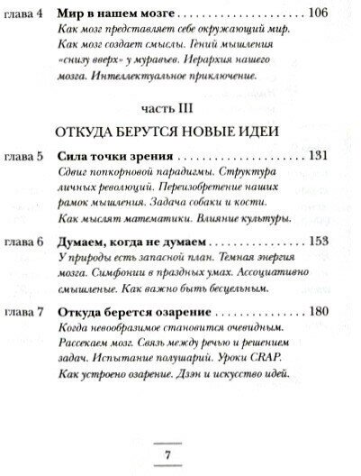 Третья часть посвящена новым идеям. Как они появляются? Почему у кого-то новые идеи появляются чаще, чем у других? Как связаны два полушария? Думаем ли мы, когда не думаем?