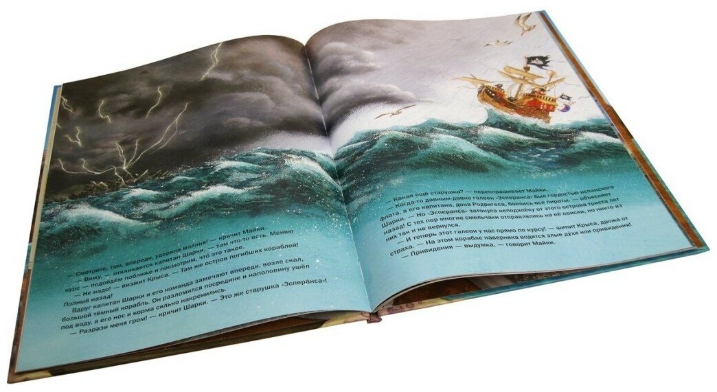 Книга формата А4. Очень яркие и подробные иллюстрации с изображением капитана и его команды. В книге содержатся сноски с объяснением некоторых слов. Из книги можно вынести понятие о храбрости и ценности дружбы. В нашей коллекции 5 книг, на 2х из них (включая эту и первую про остров сокровищ) стоит возрастное ограничение 6+. На остальных - 0+. Не знаю в чем отличие. Сегодня узнала, что в одном источнике продающем книги, эти очень популярны. Так что к покупке рекомендую.