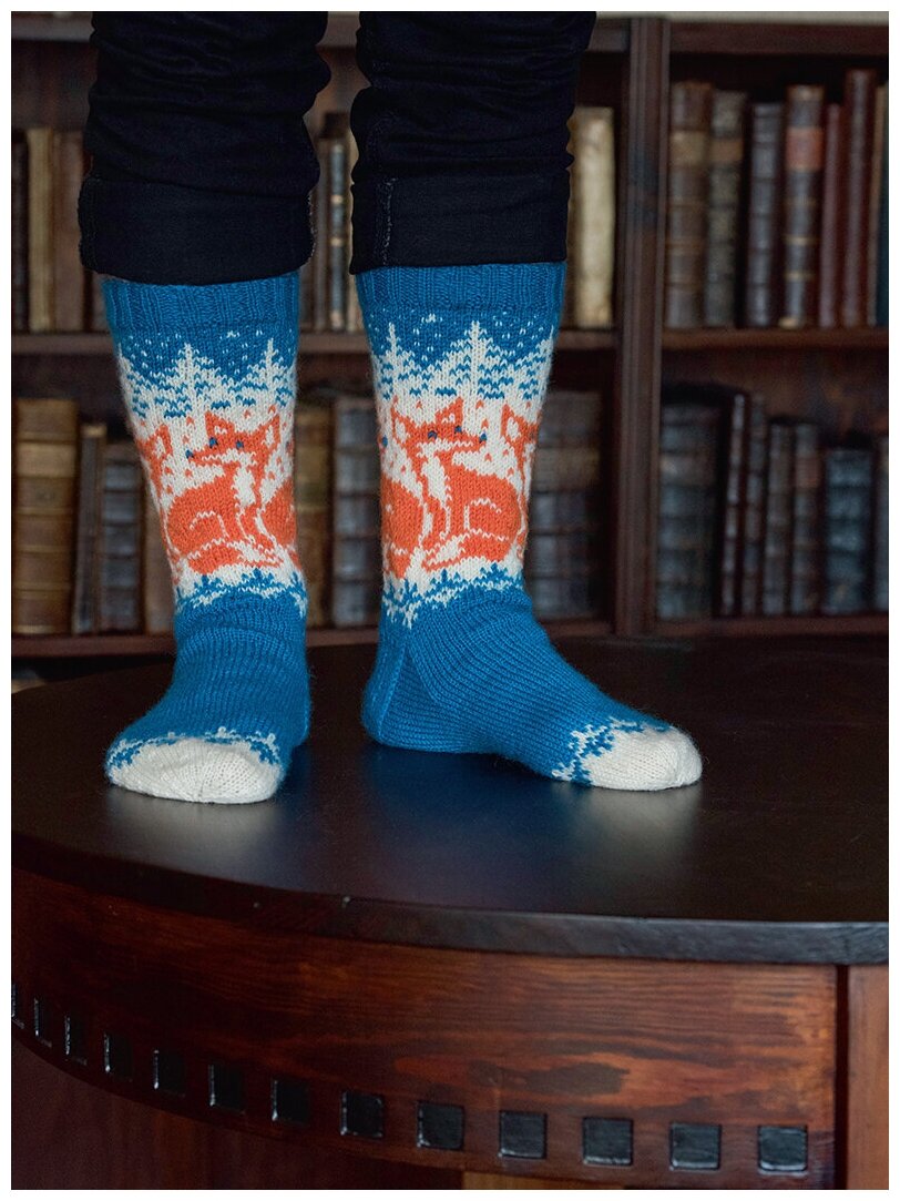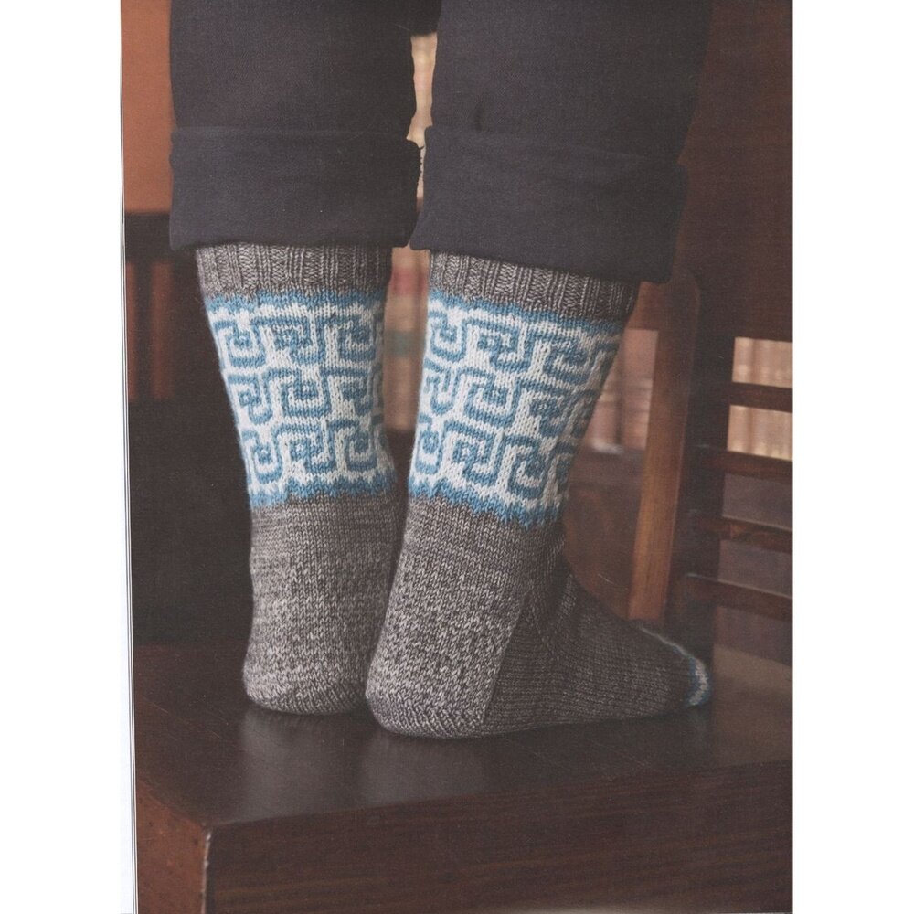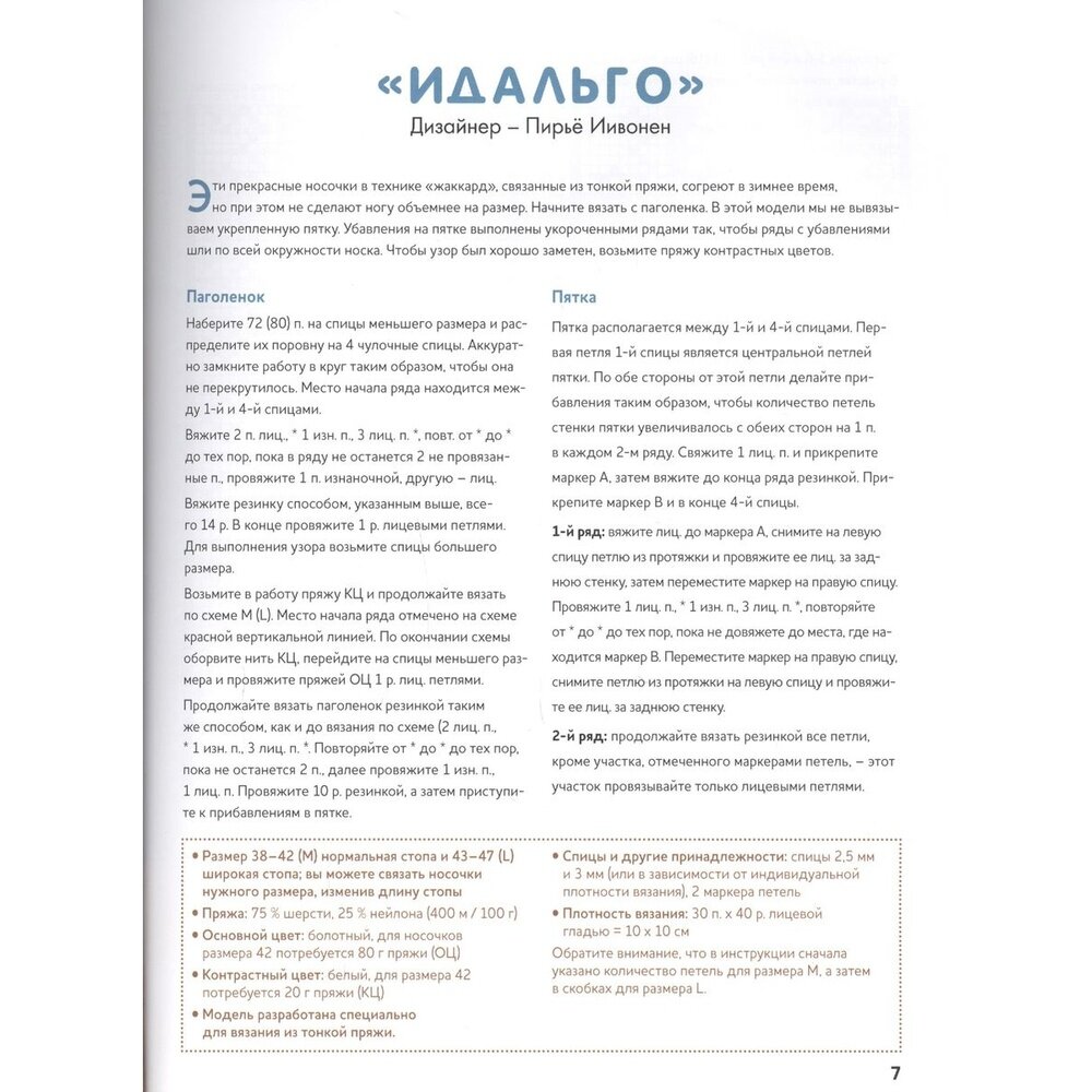 Замечательная книга! Здесь собрано более 20 схем от финских дизайнеров. Книга в твёрдой обложке, еë приятно держать в руках, разглядывать фотографии, читать описания, где дизайнеры объясняют, что вдохновило их на создание данных носков, схемы в книге напечатаны крупно, что очень удобно при вязании. Каждый найдёт модель на свой вкус: носки со слонами или лисами, носки камуфляжные, носки с аранами, носки с черепами и змеями \"Мексиканский карнавал\"(изображены на обложке) и даже носки с Эйнштейном! Многие модели подойдут не только мужчинам, но и женщинам, описание составлено для разных размеров, некоторые носки вяжутся от мыска, некоторые от паголенка, даны описания вязания разных типов пятки. Я связала стильные носки с жаккардом \"Слоны\"от Луми Кармитса, процесс небыстрый, так как схема для каждого носочка своя (на одном носке слоны направлены в одну сторону, на втором - в другую), но результат впечатляет. В планах связать ещё несколько уникальных носков.