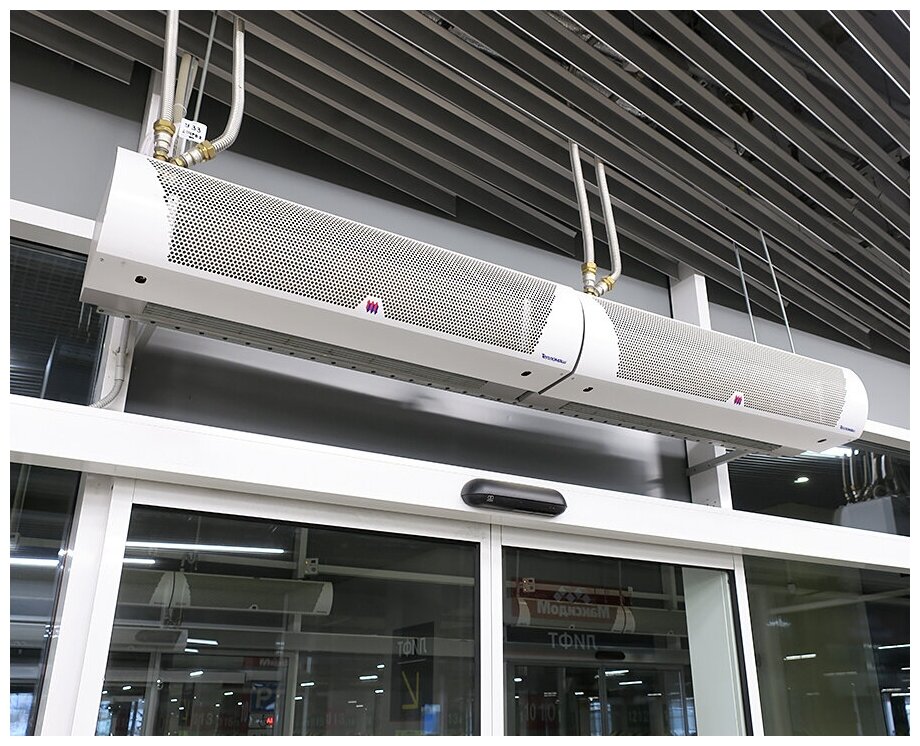 Источником тепла в водяных тепловых завесах служит горячая вода, которая подается из систем центрального отопления. Несмотря на повышенную сложность монтажа, завесы этого типа привлекательны в использовании: они дают существенный выигрыш в расходах на эксплуатацию и отличаются повышенной мощностью.