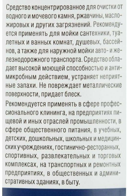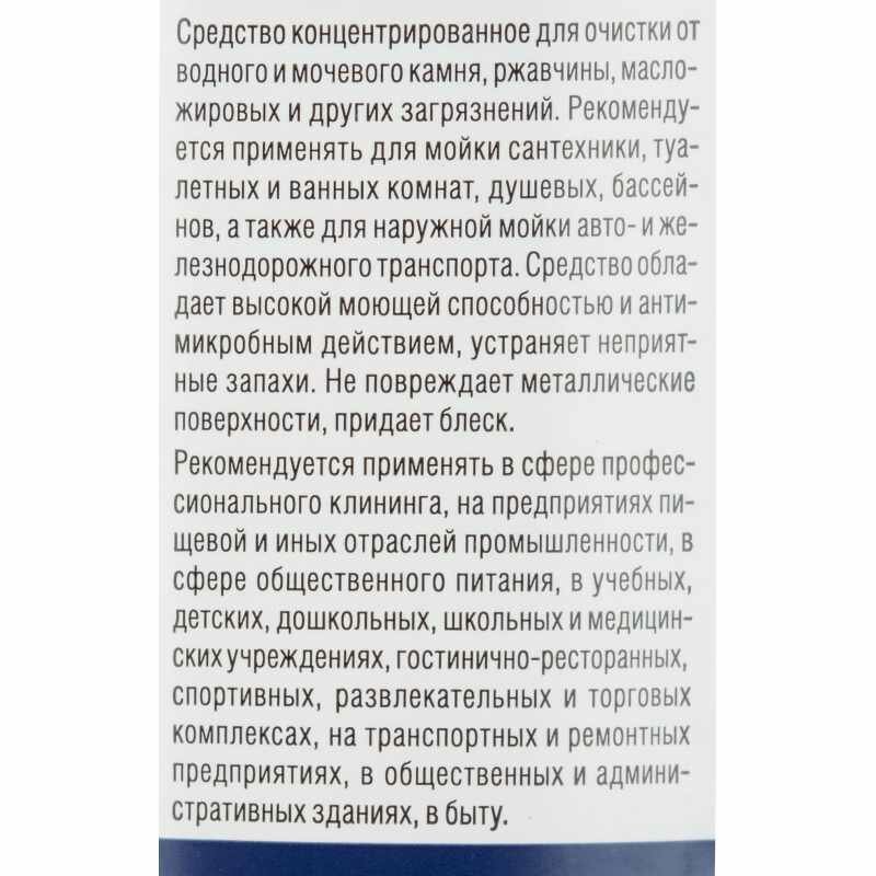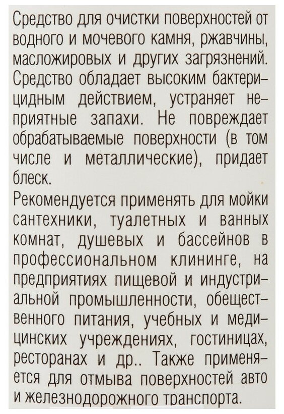 Средство для очистки различных поверхностей от водного и мочевого камня, ржавчины, масложировых, атмосферных и других загрязнений. Рекомендуется применять для мойки сантехники, туалетных и ванных комнат, душевых и бассейнов.