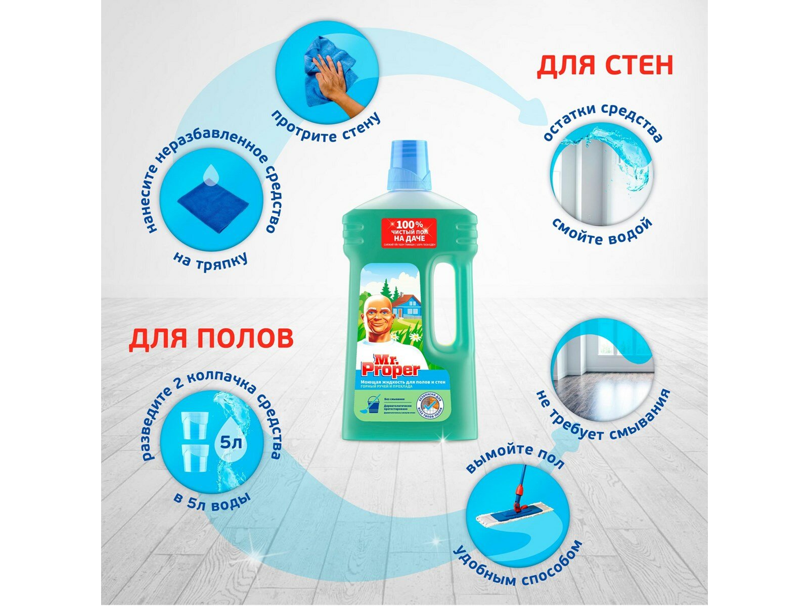 Mr.Proper отмывает полы и стены за меньшее время и с меньшими усилиями, а его безвредная рН формула подходит для уборки различных поверхностей, включая лакированный паркет и ламинат. Обладает приятным ароматом от Ambi Pur и наполняет дом натуральной свежестью. Придает блеск и не оставляет разводов. Уборка быстрее, чем при использовании воды со стиральным порошком, потому что Mr.Proper не нужно смывать. Можно использовать как в разбавленной, так и в чистой форме.