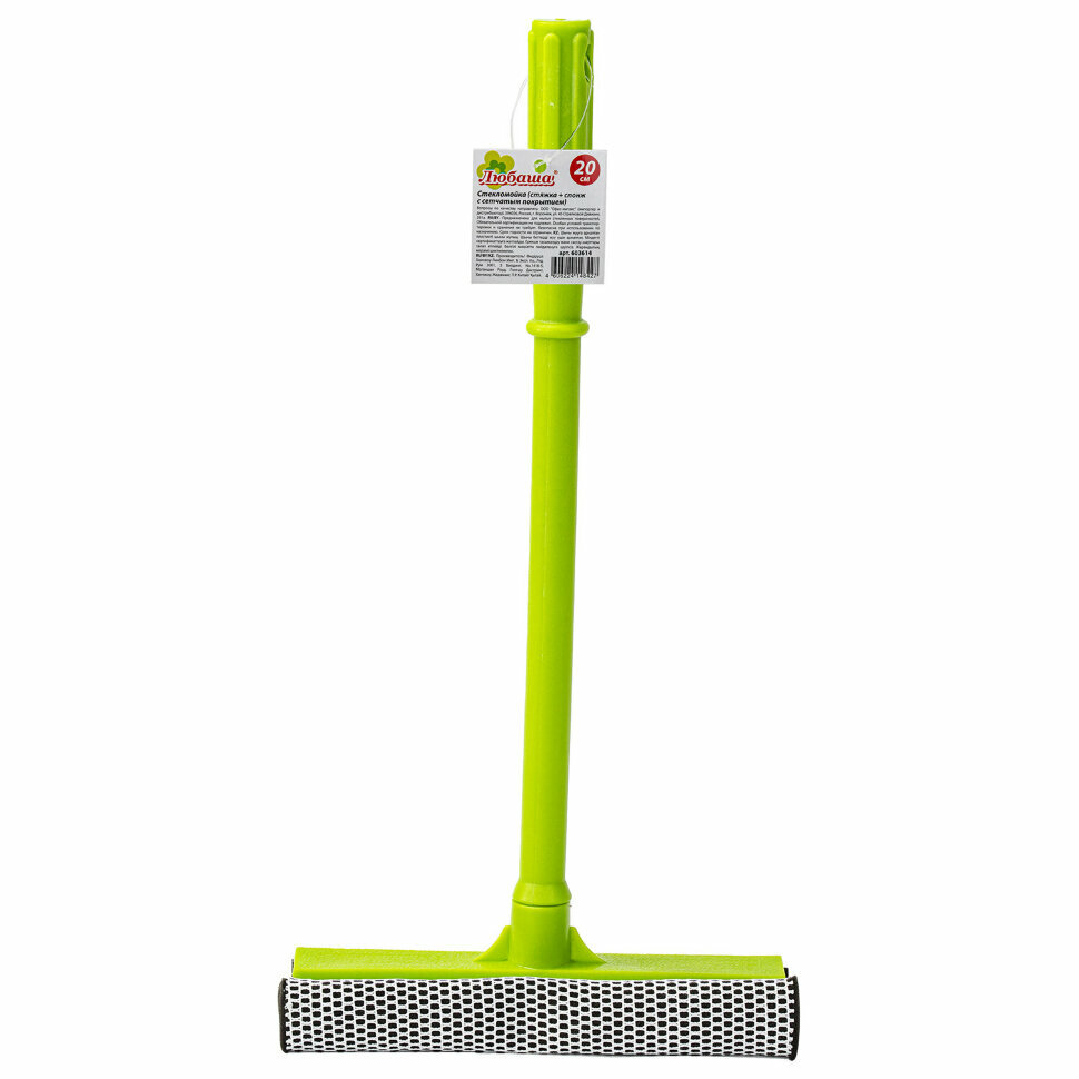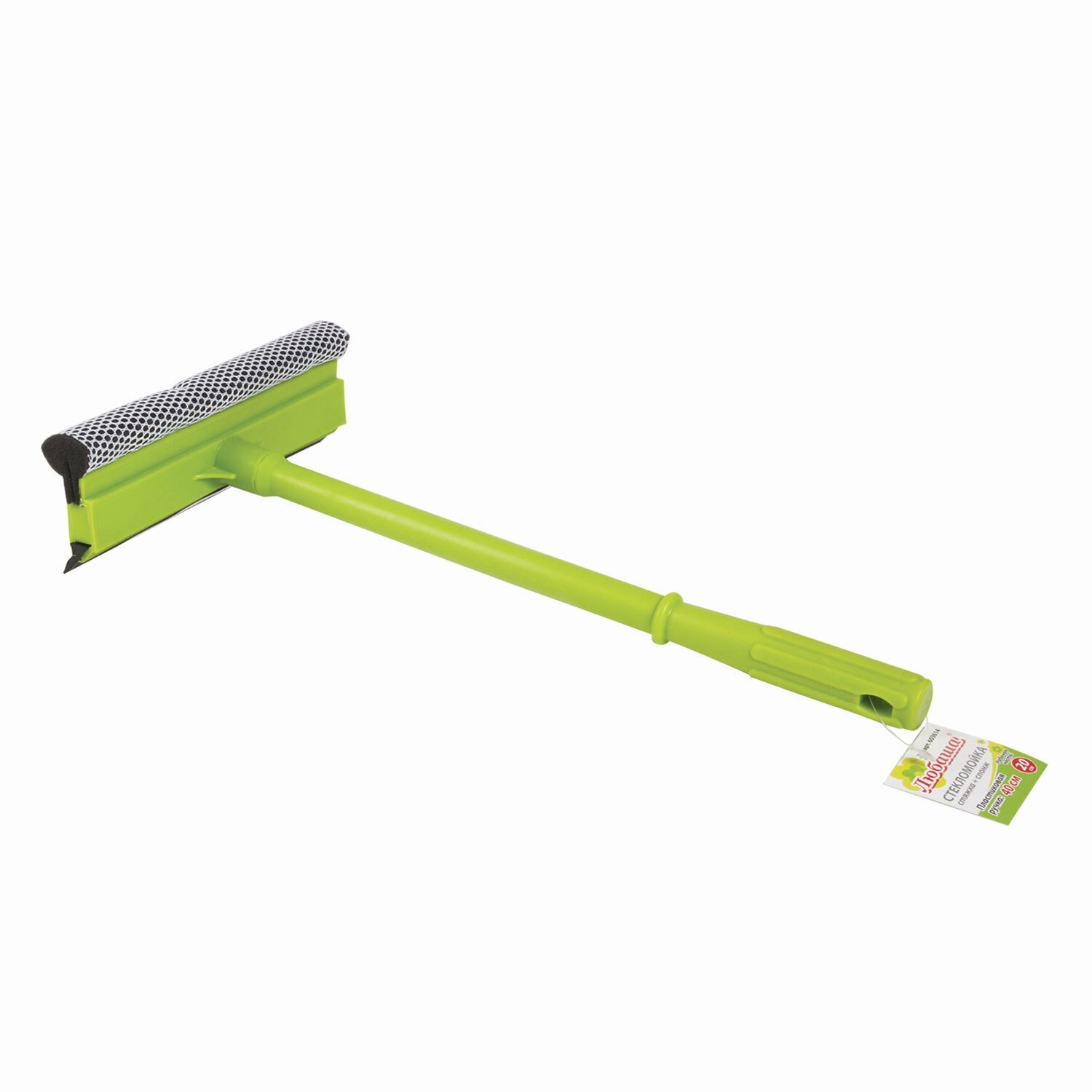 Изделие выполняет две функции: мытье стеклянной поверхности с помощью спонжа и сгон воды резиновым лезвием. Телескопическая ручка с вращающейся рабочей частью упрощает уборку. Выполнена из пластика. Длина ручки - 20 -40 см. Ширина рабочей части - 25 см.
