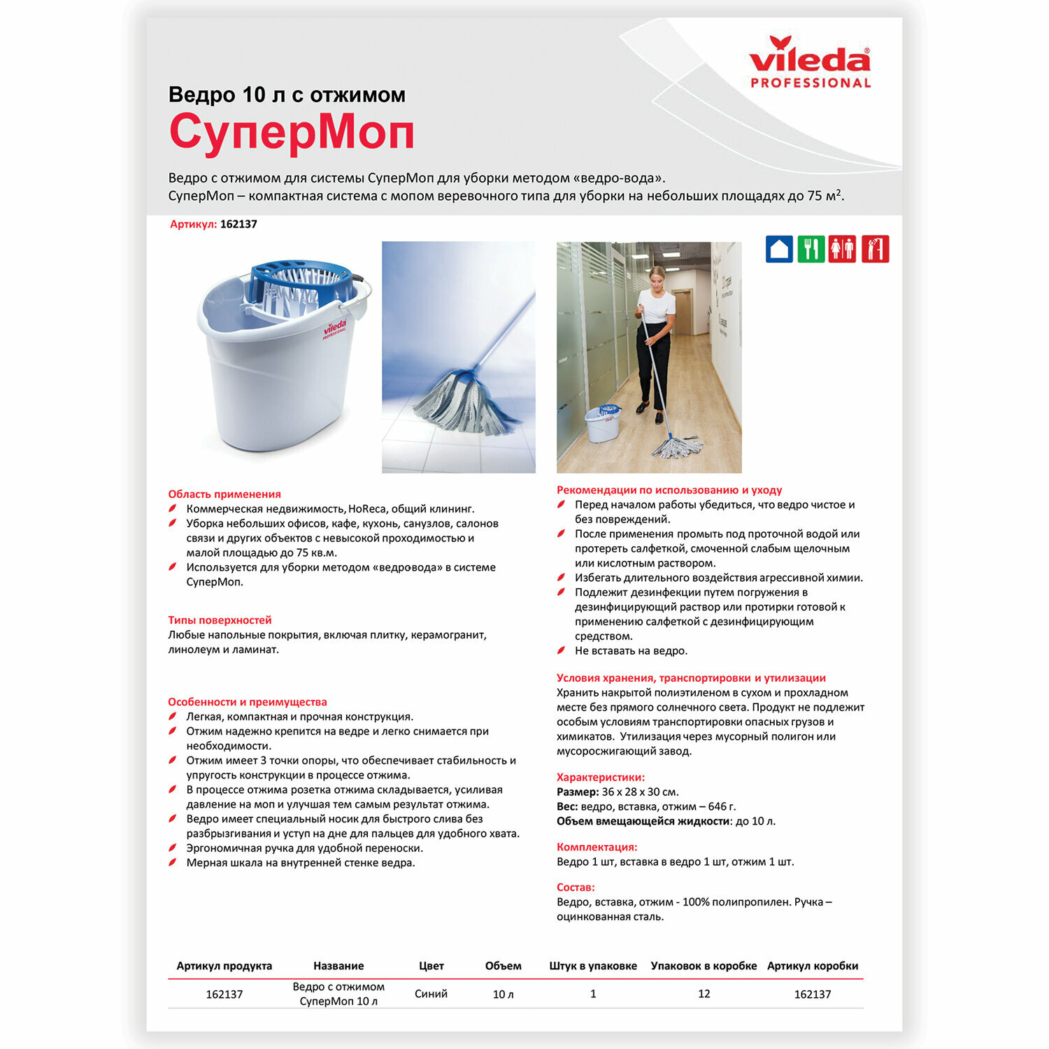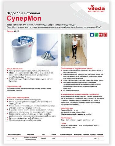 | Описание | "Супер-моп" - это легкое пластиковое ведро с отжимом, которое легко транспортировать и хранить. Подходит для уборки небольших площадей. Отжим с тремя точками опоры обеспечивает устойчивость при отжиме насадок. При необходимости отжим можно снять с ведра.,,Легкое пластиковое ведро с отжимом легко транспортировать и хранить. Подходит для уборки небольших площадей. Отжим с тремя точками опоры обеспечивает устойчивость при отжиме насадок. При необходимости отжим можно снять с ведра. На дне ведра есть уступ для пальцев для комфортного слива воды.,,На внутренней поверхности нанесена шкала для удобного дозирования моющих средств |