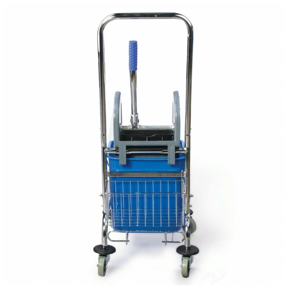 Представляет собой ведро объемом 25 л с механическим отжимом. База изготовлена из качественного металла, а инвентарь - из пластика. Колеса позволяют перемещаться в произвольном направлении. Имеются защитные диски на колесах.