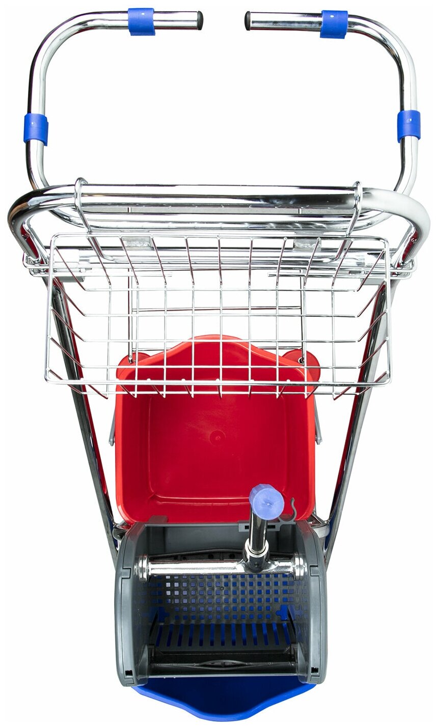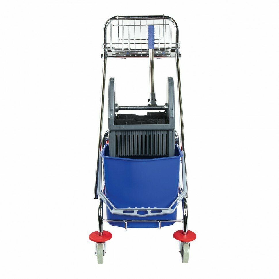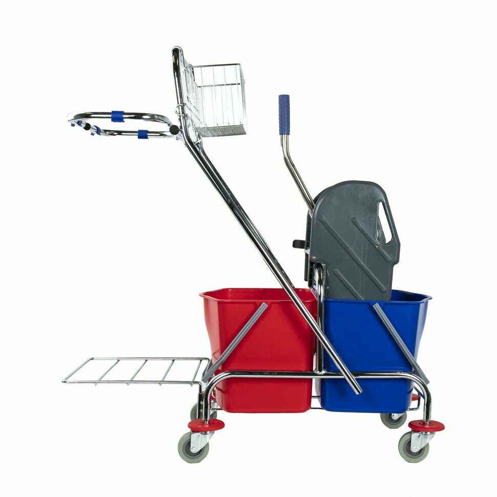 Представляет собой металлический каркас с установленными на него механическим отжимом для петельных тряпок и МОПов и 2 съемными ведрами по 20 л, корзиной для бытовой химии, держателем для мешка. База изготовлена из качественного металла, а инвентарь - из пластика. Колеса позволяют перемещаться в произвольном направлении. Имеются защитные диски на колесах.