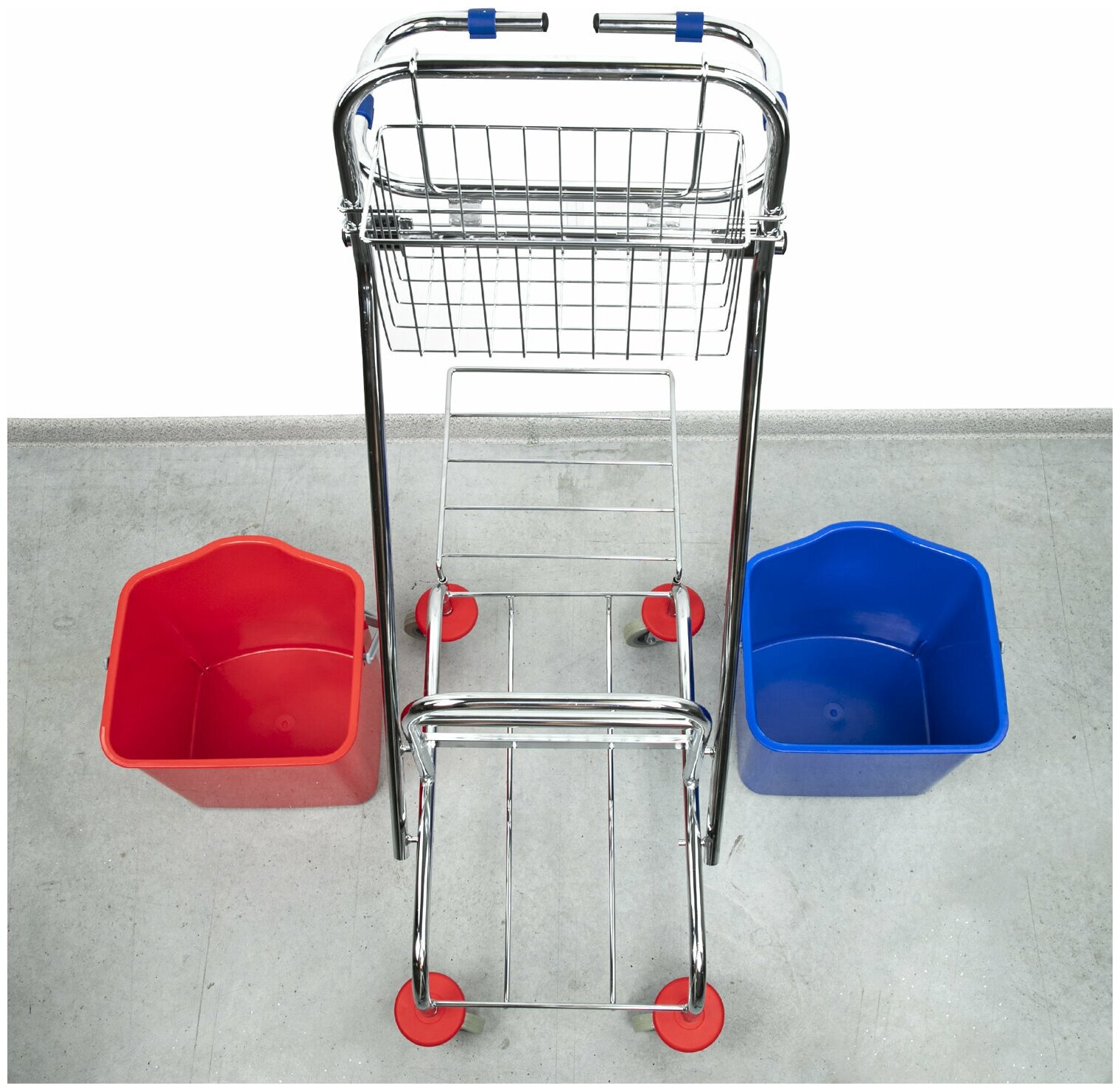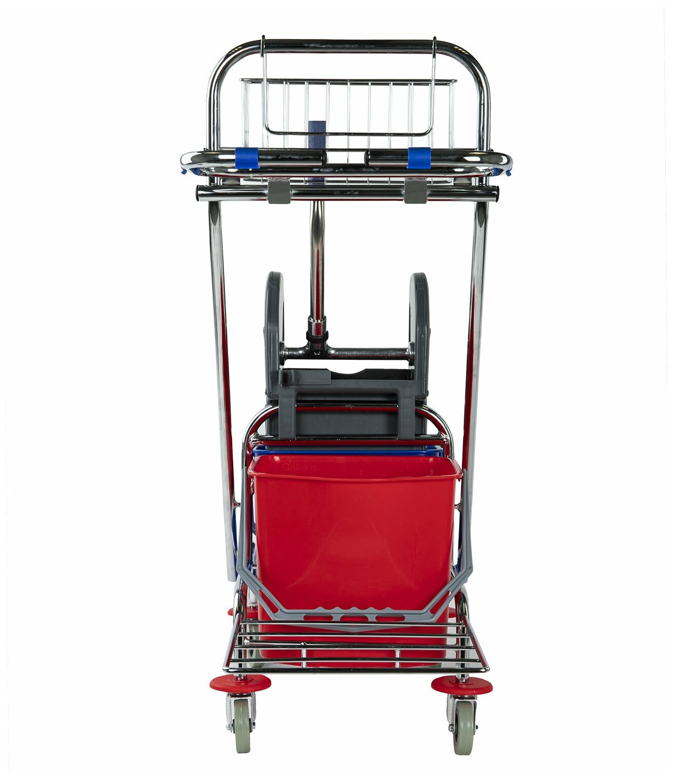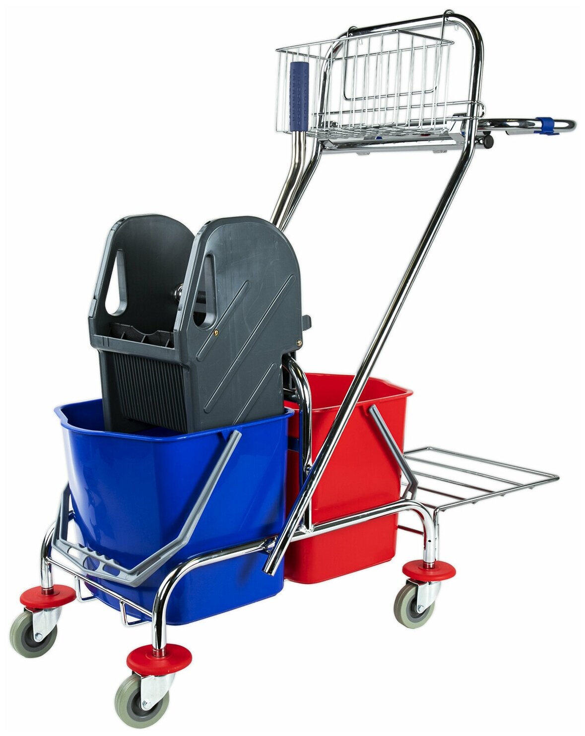 Представляет собой металлический каркас с установленными на него механическим отжимом для петельных тряпок и МОПов и 2 съемными ведрами по 20 л, корзиной для бытовой химии, держателем для мешка. База изготовлена из качественного металла, а инвентарь - из пластика. Колеса позволяют перемещаться в произвольном направлении. Имеются защитные диски на колесах.