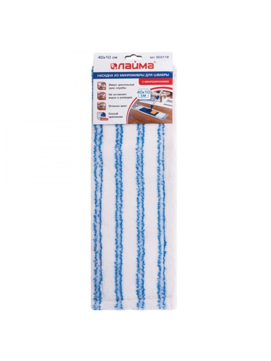 Моп имеет форму плоского прямоугольника, такая форма и чистящая поверхность из ворса длиной 0.8 см позволяет удобно собрать грязь по углам и захватить большую площадь убираемой поверхности, что в свою очередь уменьшает временные затраты на уборку больших площадей. Устойчива к износу, что обеспечивает долгий срок службы уборочного инструмента. Выполнена из микрофибры и имеет размер 40х10 см. Максимальный объем впитывания - 150 мл. Используется в комплекте со шваброй, крепится к держателю с помощью карманов.